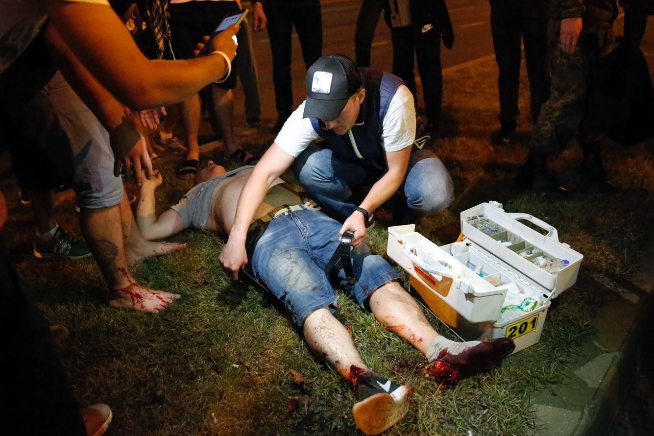 У стелы в протестующих, которые оказывали помощь пострадавшему, кинули светошумовую гранату.