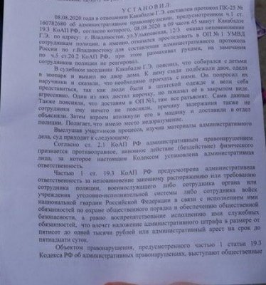 Какабадзе признали виновным по статье о неисполнении законного требования полицейского (ч. 1 ст. 19.3 КоАП). По мнению полиции и суда, он отказался добровольно проследовать в отдел полиции для составления протокола.