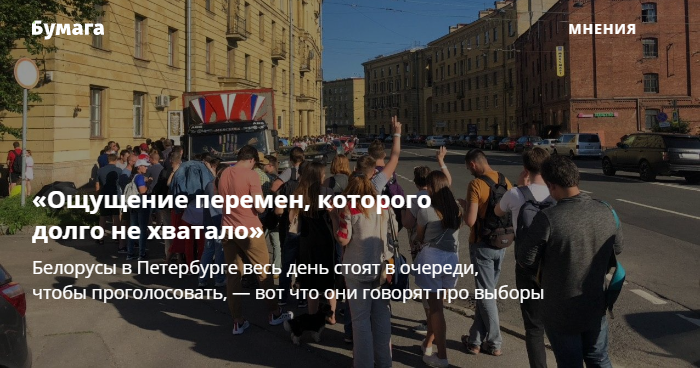 Я пришел [к посольству Беларуси], чтобы показать, что я тоже есть и что мой голос чего-то стоит. С утра, когда начались новости об огромных очередях, маленькой скорости голосования и «состоявшихся выборах», стало довольно очевидно, что проголосовать уже вряд ли получится, но смысл этих выборов — не только поставить галочку, но и показать, что мы есть и нас много. И что мы совсем не «народец», которым нас считает Лукашенко.