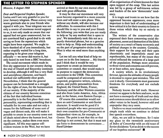 © Index on Censorship Письмо Павла Литвинова в «Индексе цензуры». Январь 1992 года Спендер проконсультировался с философом Стюартом Хэмпширом по поводу формирования комитета из видных интеллектуалов, и они обратились к богатому редактору газеты The Observer Дэвиду Астору с просьбой, чтобы тот вступил в этот комитет и предоставил необходимые средства для того, чтобы комитет мог предпринимать какие-то действия. Для такого шага были веские основания. В 1961 году Астор опубликовал статью британского юриста Питера Бененсона о правах человека, которая привела к созданию «Международной амнистии» — крупнейшей и наиболее эффективной правозащитной организации своего времени.