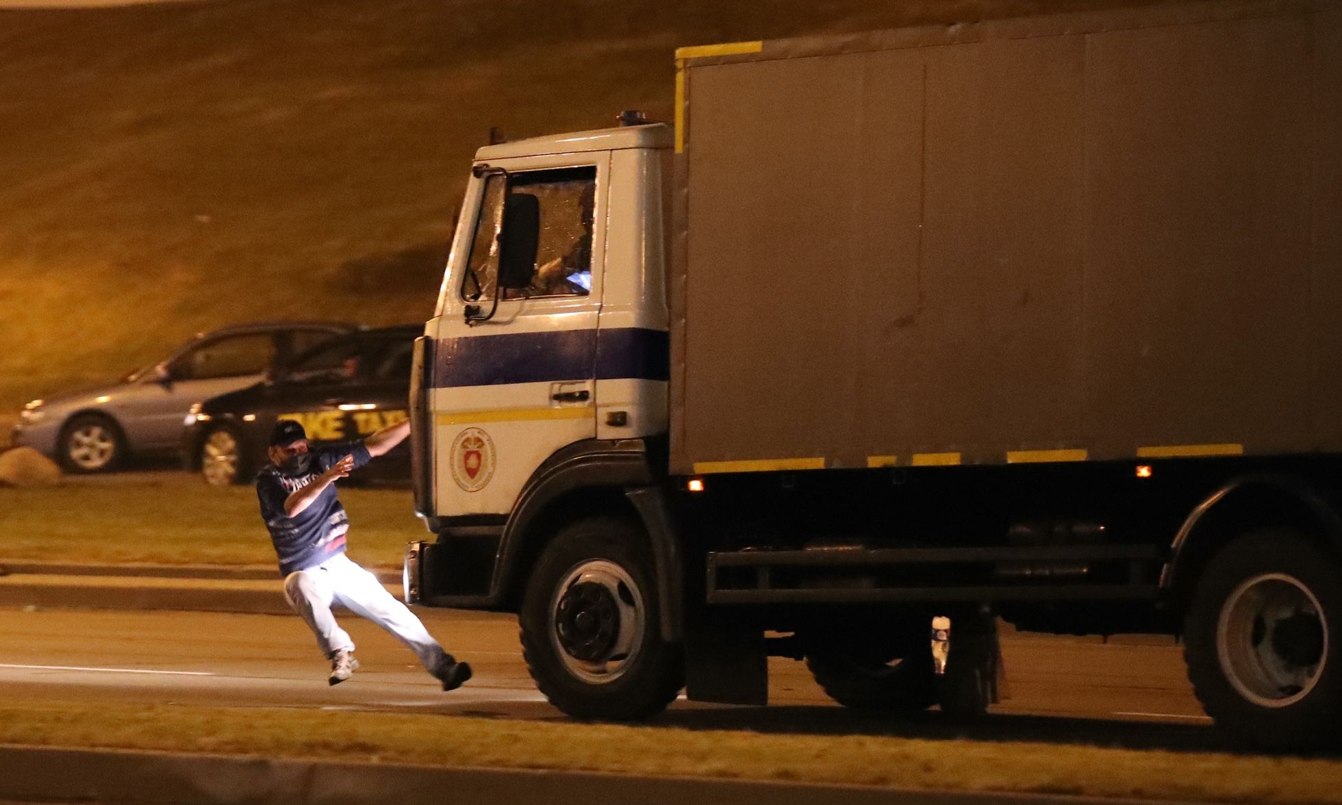 Татьяна Зенькович / EPA / Scanpix / LETA В центре Минска в ходе протестов в ночь после президентских выборов активисты попытались остановить автозак. Один из них зацепился за передний бампер машины — и когда водитель набрал скорость, не удержался и упал под колеса. Протестующего доставили в больницу, о тяжести полученных им травм не сообщается.