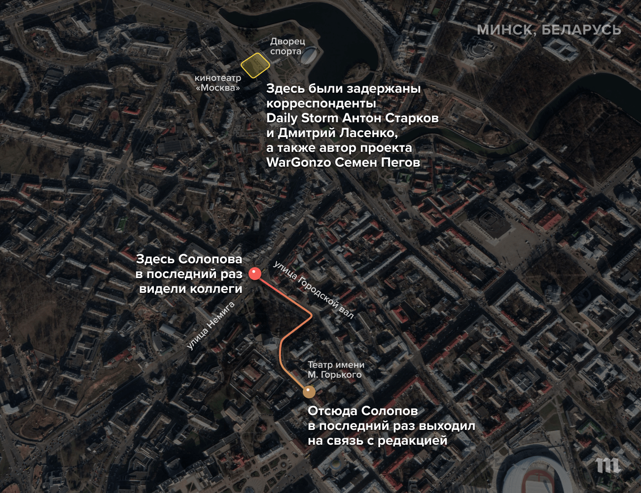 Если верить словам журналиста Daily Storm, ставшего свидетелем нападения на Солопова, задержание спецкора «Медузы» могло также произойти на проспекте Победителей — это бы значило, что Максиму удалось вырваться из оцепления ОМОНа у театра имени Горького и пройти по улицам Минска еще около 20 минут.