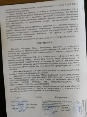 Ленинский районный суд Тамбова 7 августа оштрафовал на 10 тысяч рублей местного жителя Олега Бондарева. Об этом он сам сообщил ОВД-Инфо.