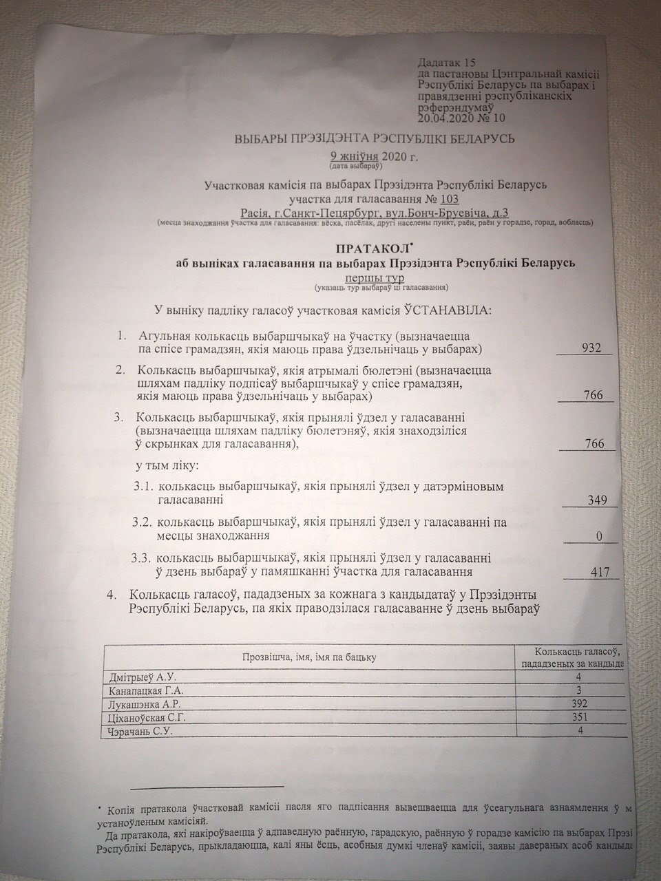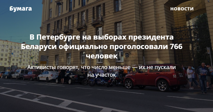 На выборах президента Беларуси в Петербурге, по официальным данным, проголосовали 766 человек. Это следует из итогового протокола, а также информации ТАСС.