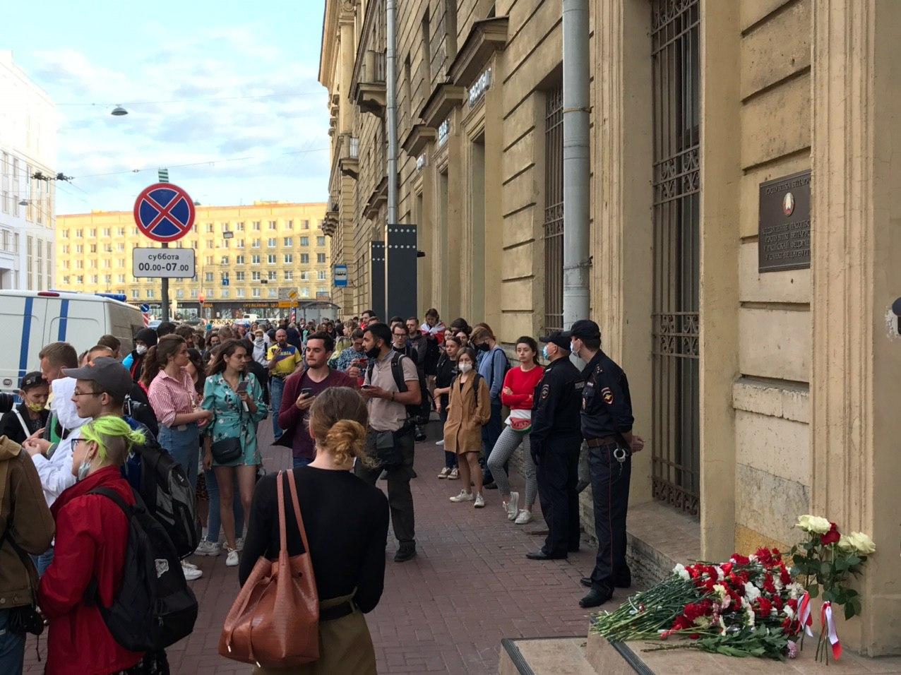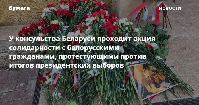 У консульства Беларуси в Петербурге проходит акция солидарности с белорусскими гражданами, которые протестуют против итогов выборов президента. По подсчетам корреспондента «Бумаги» там собралось около 70 человек.
