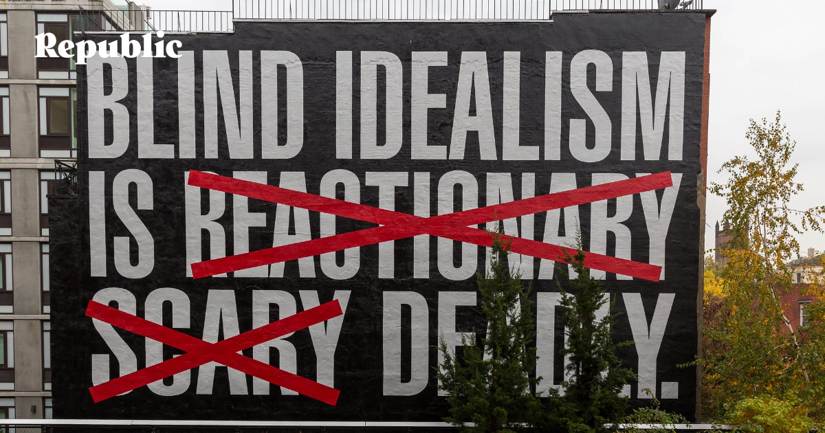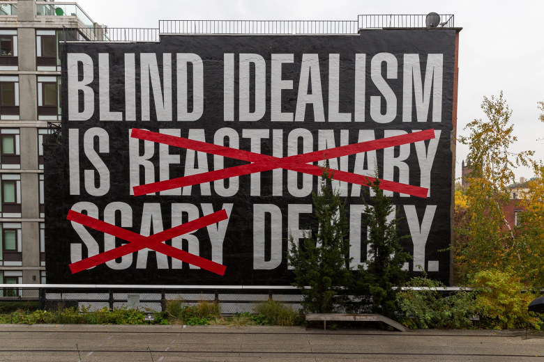 "Слепой идеализм реакционен (зачеркнуто), страшен (зачеркнуто), смертелен". Мурал Барбары Кругер в парке Хайлайн, Нью-Йорк, 2016
