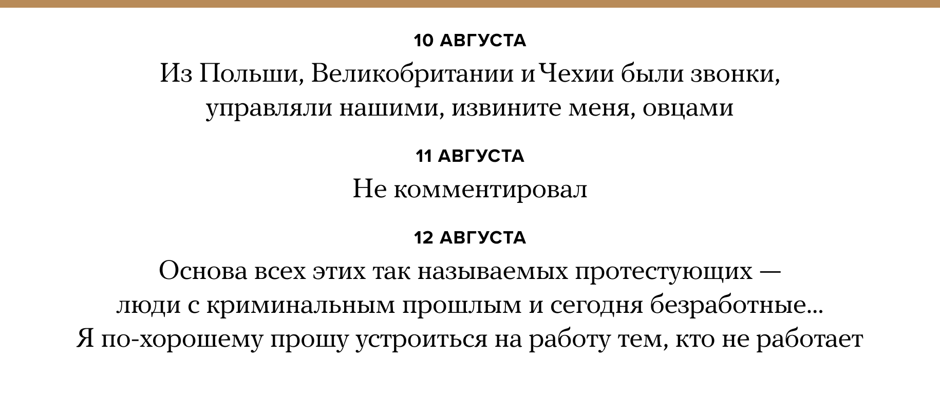 Президент Беларуси Александр Лукашенко за последние дни дважды высказался о протестах, начавшихся 9 августа после президентских выборов, на которых, по данным ЦИК страны, он всех победил (остальные кандидаты так не считают). 10 августа Лукашенко назвал демонстрантов «овцами», которыми управляют «кукловоды» из других стран, а 12 августа сообщил, что в основном в протестах участвуют «люди с криминальным прошлым и сегодня безработные».