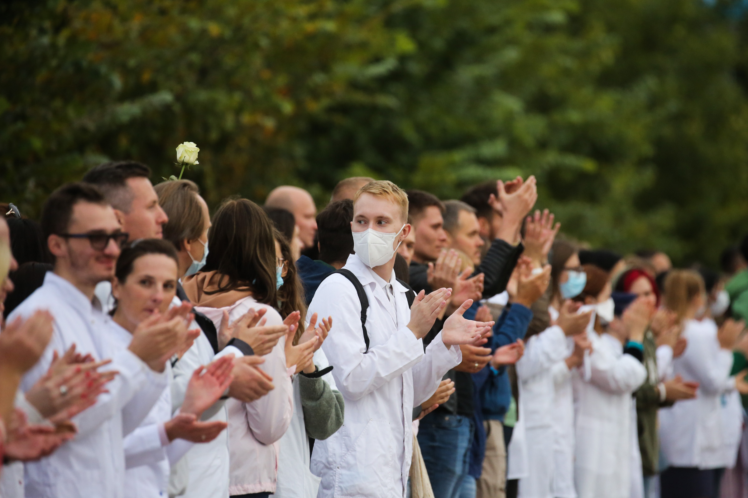 В белорусской столице в среду на акцию против насилия вышли более 130 медиков. Они собрались в белых халатах на проспекте Дзержинского, у медуниверситета, с цветами и плакатами. По словам врачей, они вышли, чтобы показать, что "все мы вместе".