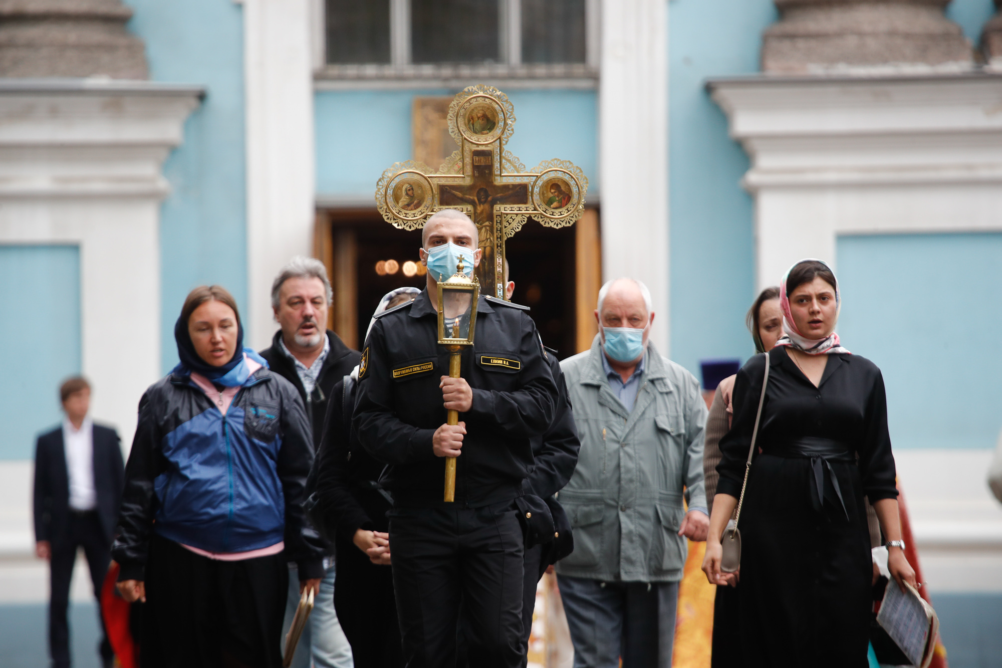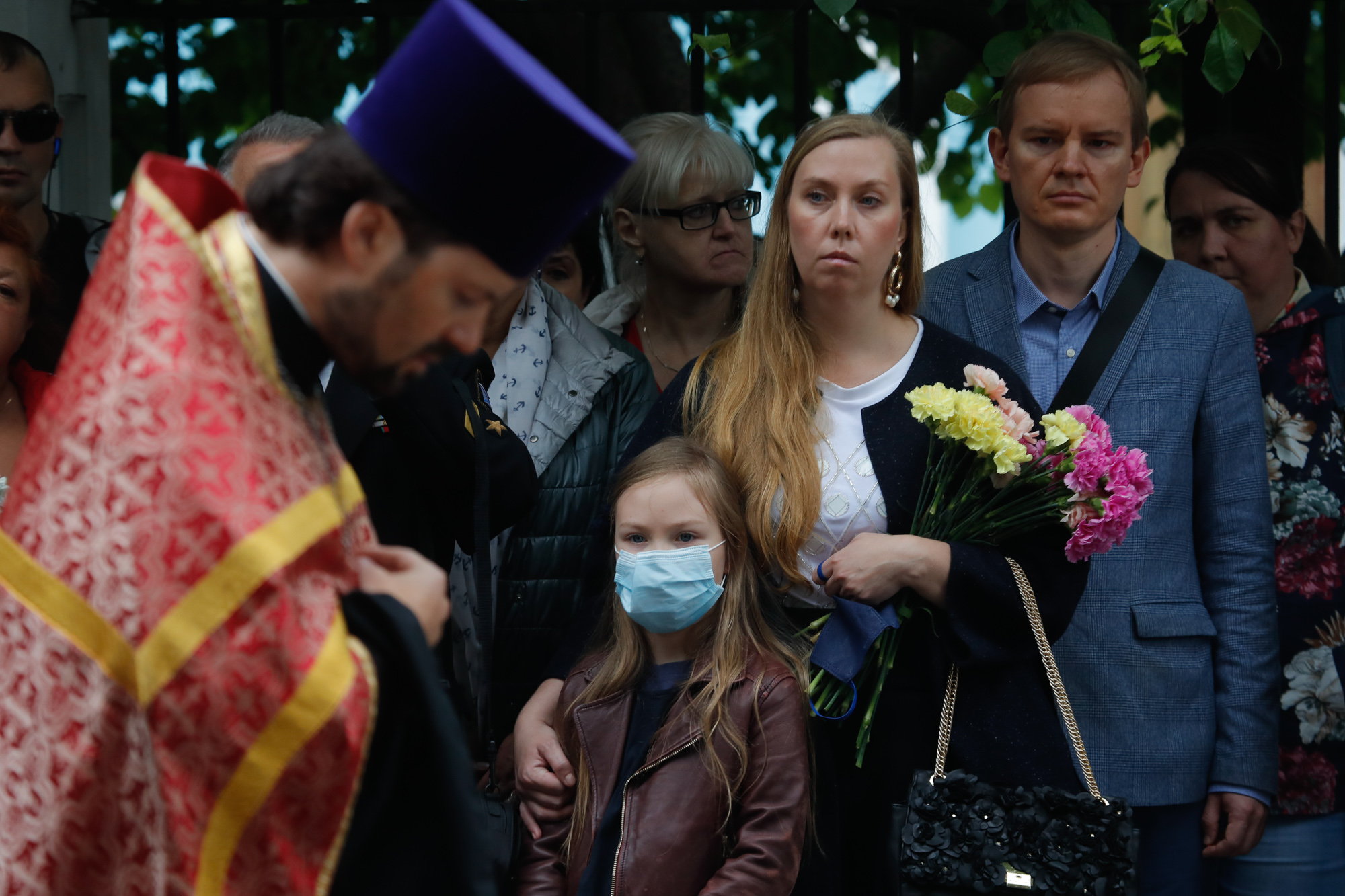 В 11 часов на улице перед собором больше 100 человек. Каждый год здесь проводят литию, заупокойную службу. Священнослужители читают имена всех 118 моряков, которые погибли в августе 2000 года.