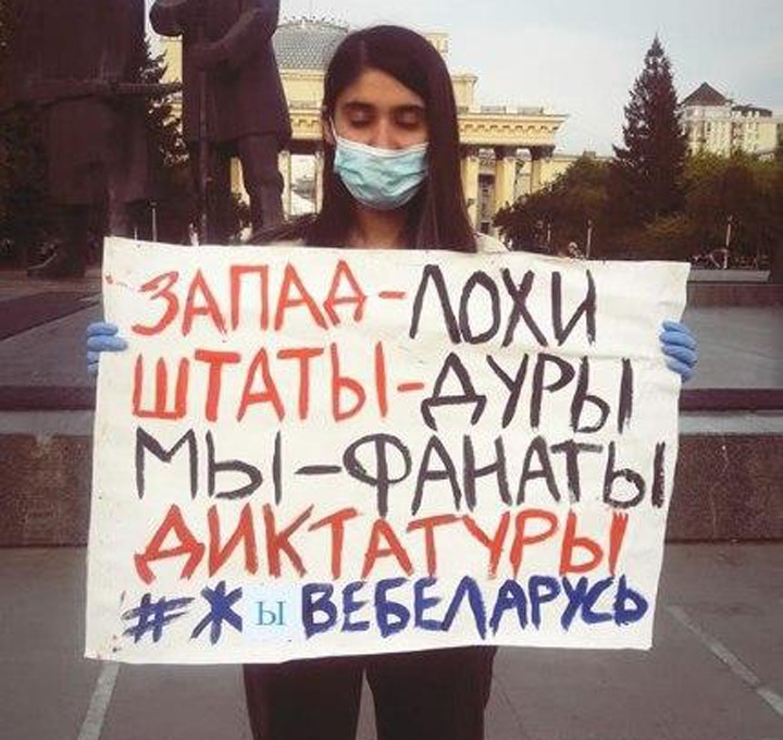 Кроме того, 10−11 августа в Новосибирске прошло несколько одиночных пикетов в поддержку протестующих в Белоруссии. Сначала их провели у представительства республики, еще две девушки встали на площади Ленина с плакатами: «Честных выборов» и «Запад — лохи, Штаты — дуры, мы — фанаты диктатуру #ЖИВЕБЕЛАРУСЬ».