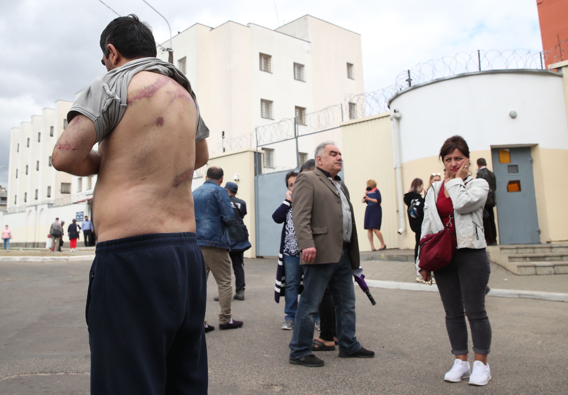 Пострадавший при разгоне протестов показывает полученные травмы рядом с изолятором в Минске. Фотография