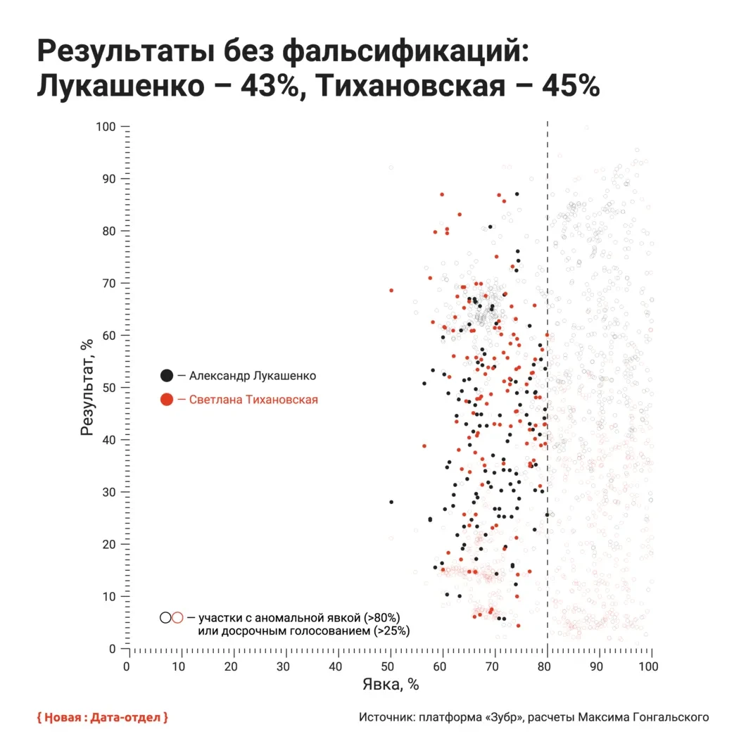 Анализ показывает, что часть комиссий сфальсифицировали результаты голосования: на таких УИКах доля голосов за Тихановскую оставалась на уровне от 5 до 15% вне зависимости от явки, а большинство голосов было в пользу Лукашенко.
