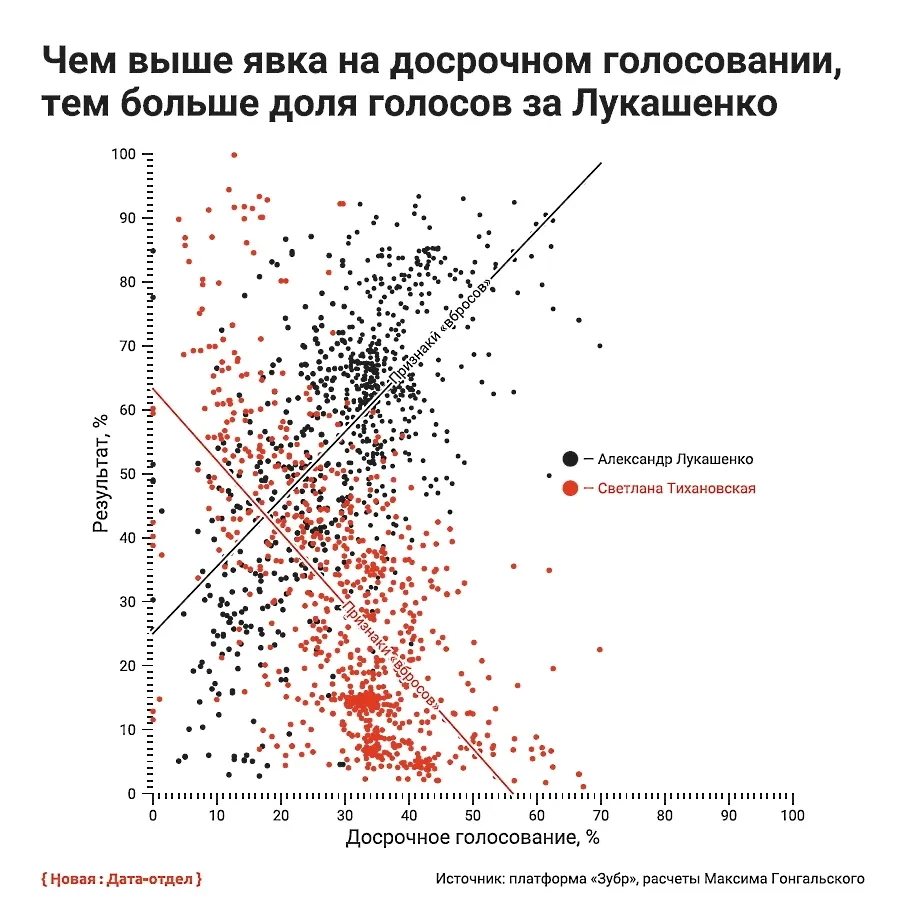 На участках с нормальной досрочной явкой Тихановская набрала больше голосов. «Высокий процент досрочки в целом связан со вбросами — комиссия вбрасывает [голоса за Лукашенко], пока никого нет. Но в этом тренде есть и объективная часть: оппозиция призывала голосовать в последний день, поэтому сторонники Тихановской пришли именно в последний день — на участках, где она набрала много голосов, досрочного голосования меньше», — говорит Гонгальский.