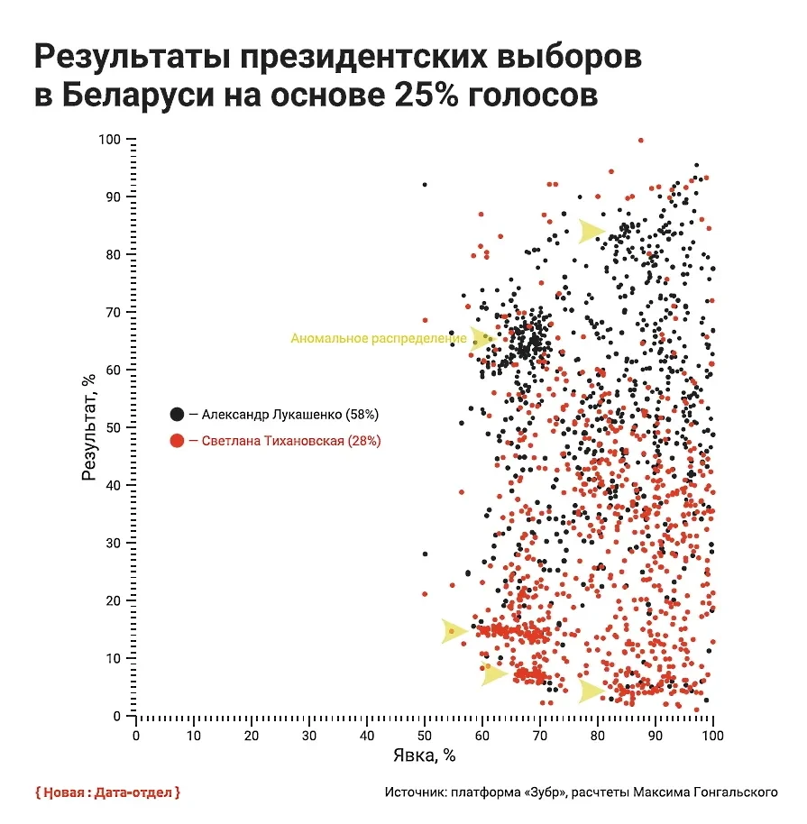 «На этих участках видно, что комиссия фактически нарисовала определенный процент голосов Тихановской: это группа участков, которые часто отличаются по явке, но процент за Тихановскую у них одинаковый. Этим точкам соответствуют такие же скопления голосов за Лукашенко наверху.