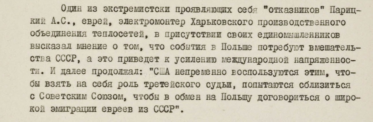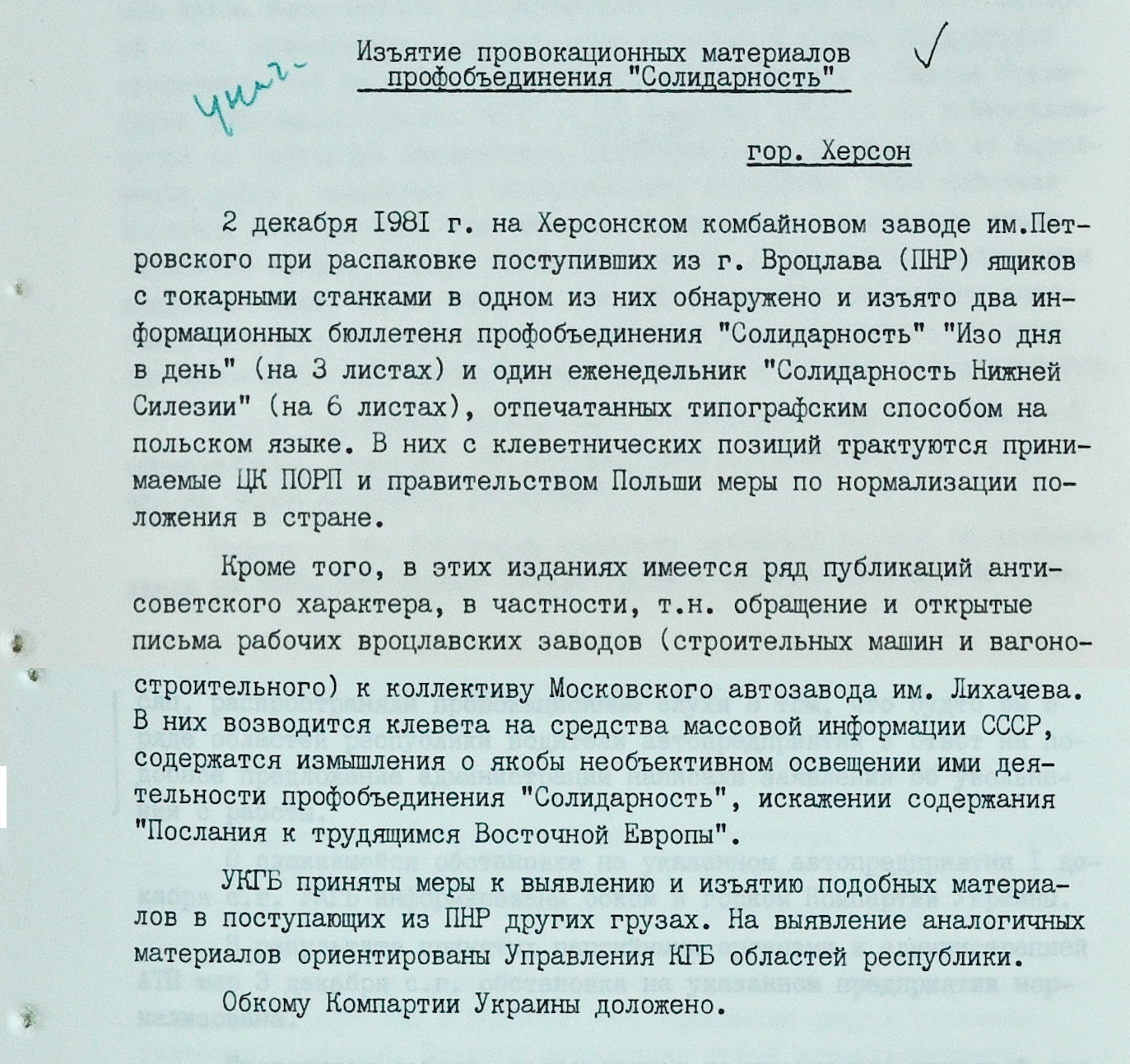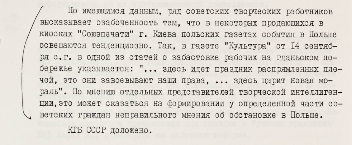 Власть, конечно, не хотела «как в Польше». События в соседней стране, входившей в социалистический блок, на какое-то время стали главным раздражителем для советского режима. По крайней мере, именно такие выводы напрашиваются, если перечитать все те же сообщения КГБ для Центрального комитета Компартии Украины за 1980-81 годы. Польская тема в них оттеснила на второй план все остальные — в том числе .