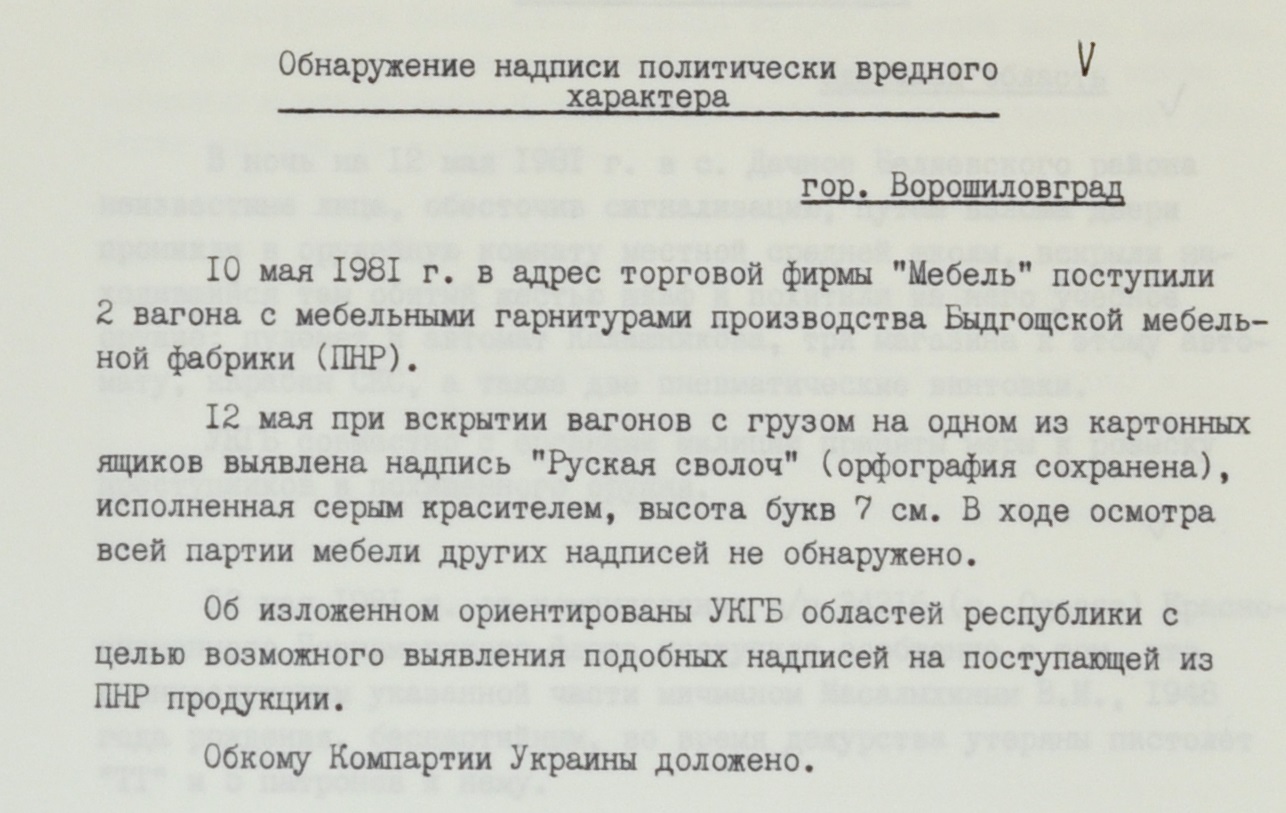На вагоне одного из советских поездов в октябре 1980 года какие-то поляки нарисовали мелом карикатуру и подписали антисоветскими лозунгами. А в мае 1981-го на ящиках с мебелью, пришедших в из польского Быдгоща, обнаружили надпись «Руская сволоч».