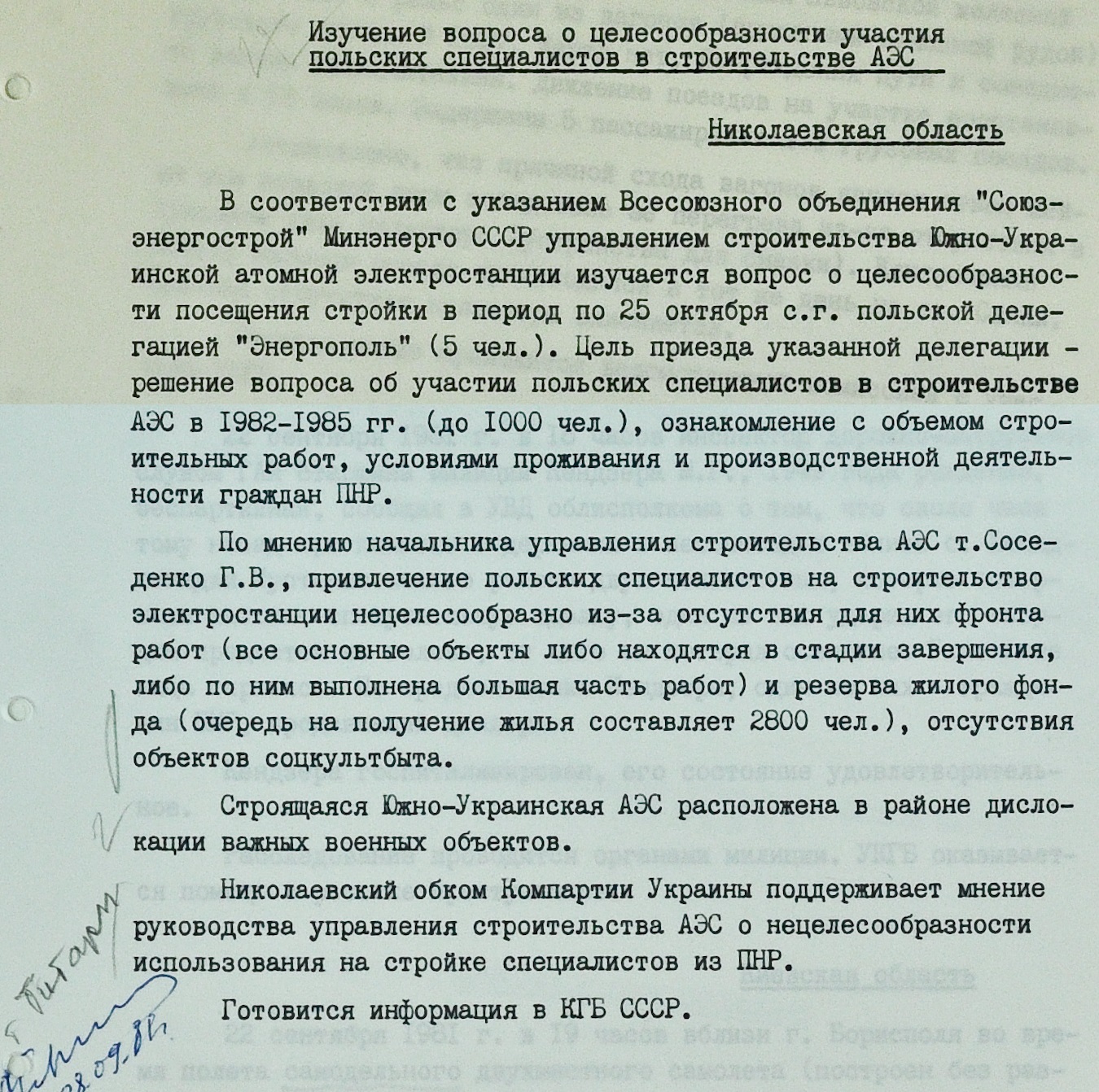 В Николаевской области готовили к открытию Южноукраинскую АЭС. Планировалось, что в 1982-1985 годах на стройке будут работать польские специалисты — тысяча человек. Но в сентябре 1981-го, когда из ПНР на станцию прибыла делегация обсудить детали, им объяснили, что обойдутся и без иностранной помощи.