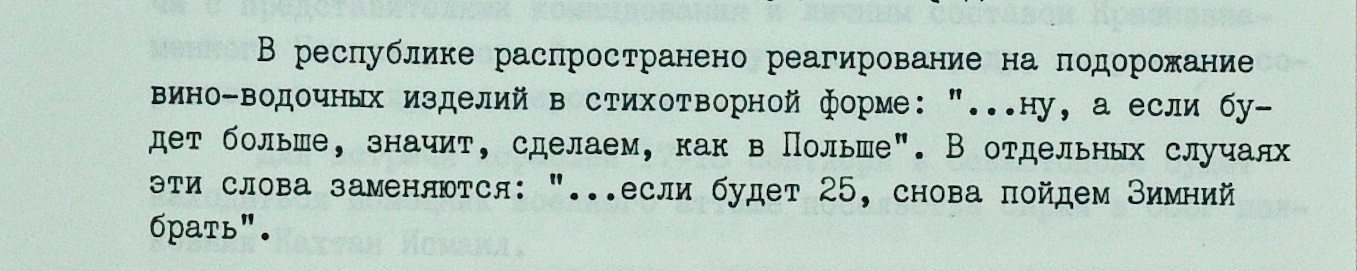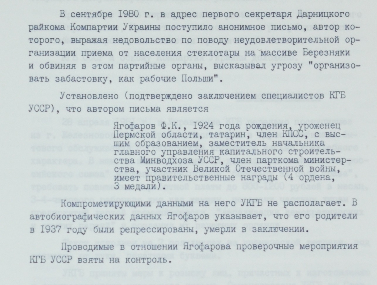 «Обращает на себя внимание, что за имели место 7 фактов распространения листовок и анонимных писем с призывами к забастовкам по примеру проводимых в Польше (за весь 1979 год отмечено 5 призывов к забастовкам в связи с перебоями в снабжении продуктами питания)», — говорится в одной из записок КГБ.