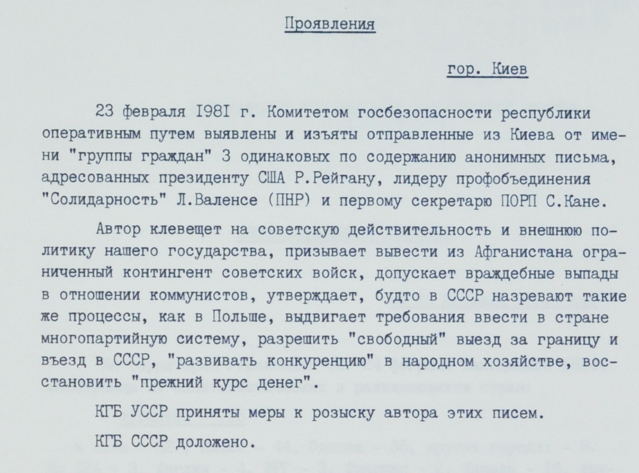 Среди писем, отправленных из Киева в феврале 1981-го, нашли три одинаковых, отправленных президенту США Рональду Рейгану, польскому лидеру Станиславу Кане и Леху Валенсе. Неизвестный автор — письма были анонимными — «клеветал на советскую действительность», и среди прочего утверждал, что польские процессы повторятся в СССР.
