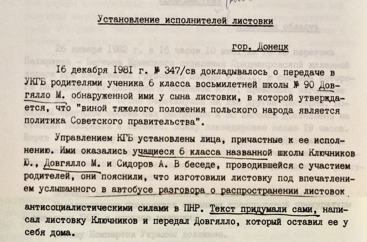 Оппозиционную волну подхватывали даже дети. В Донецке в декабре 1981 года родители шестиклассника отнесли в КГБ найденную у него листовку с утверждением, что «виной тяжелого положения польского народа является политика Советского правительства». Оказалось, что школьник подслушал в автобусе разговор о Польше, после чего сделал листовку вместе с двумя одноклассниками. С детьми и родителями провели профилактические беседы.