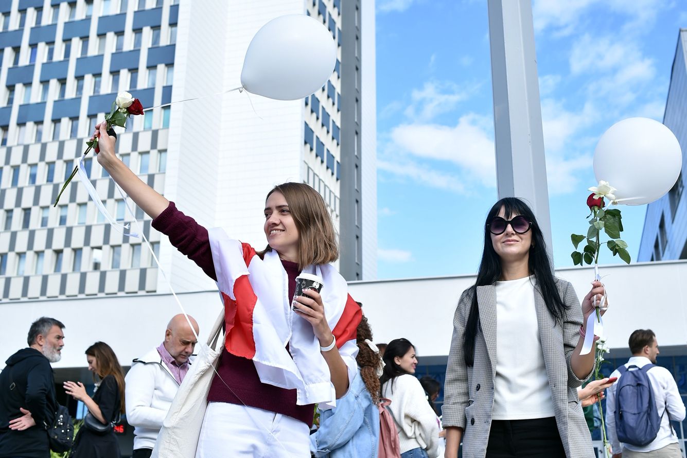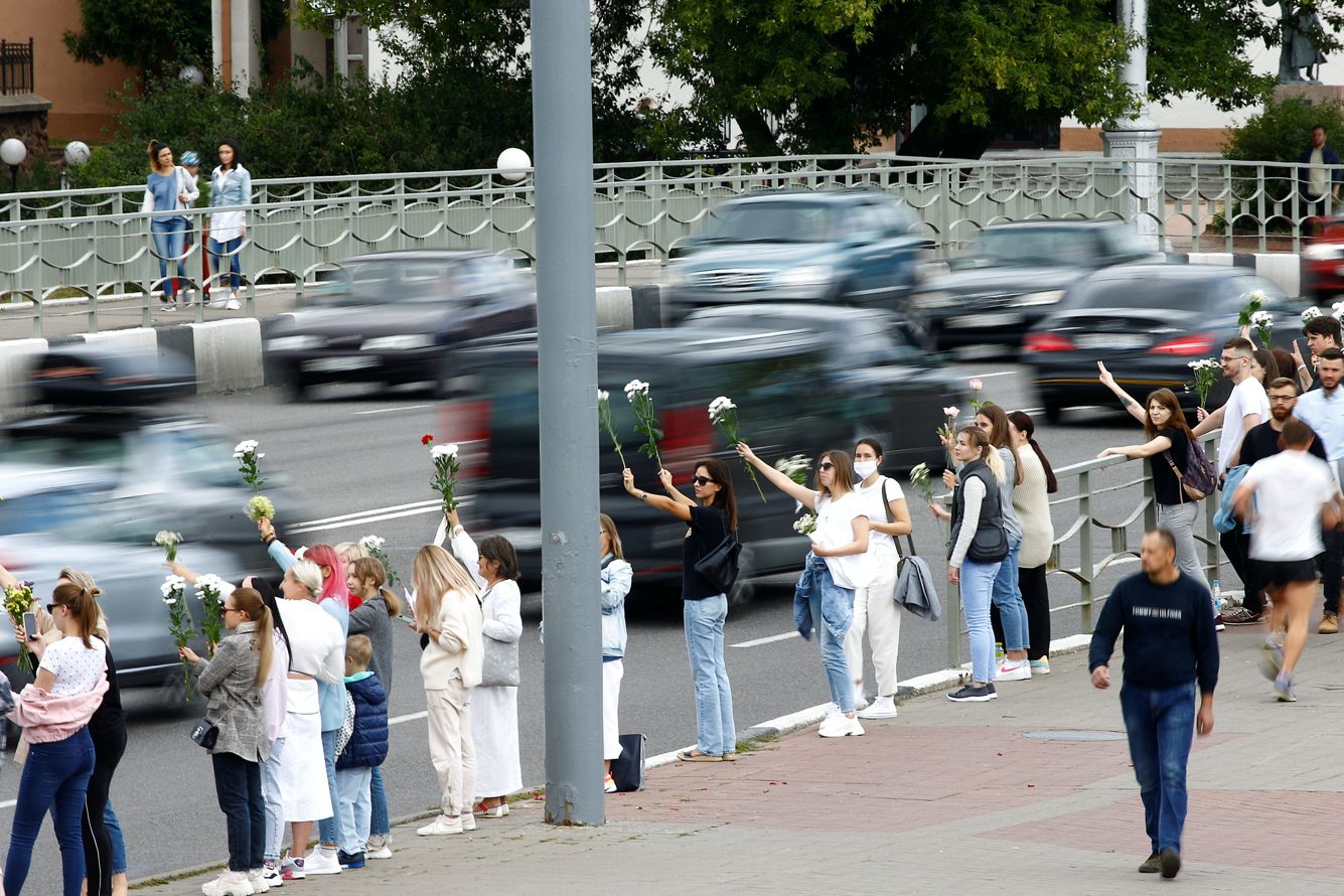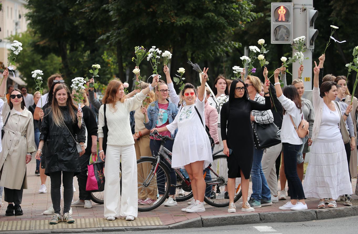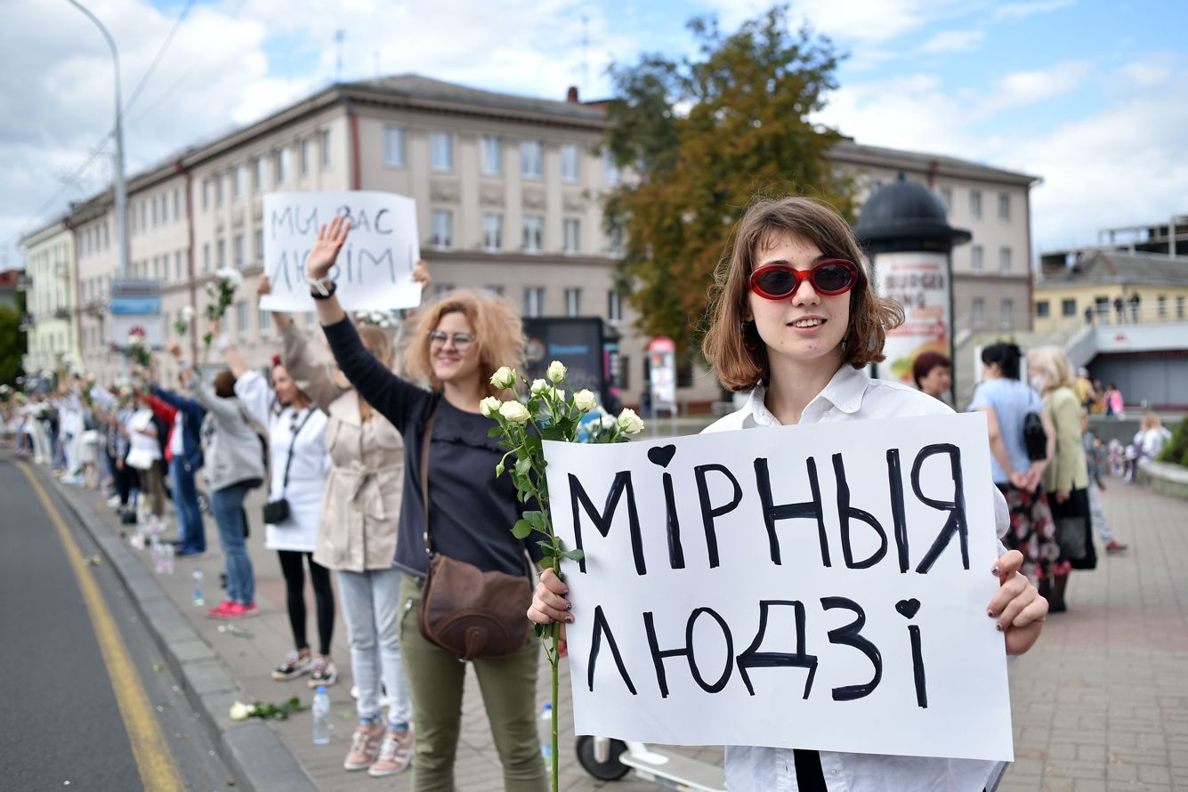 Belarus witnessed its fifth day of mass protests on Thursday, August 13, as people continued to demonstrate in opposition to the results of the presidential elections, which claim that incumbent President Alexander Lukashenko (Alyaksandr Lukashenka) won by a landslide 80 percent. During the day, people in cities throughout the country formed solidarity chains opposing the violence security forces used against protesters: these peaceful rallies were led by women who wore white and carried flowers. Large groups of doctors, transport workers, and factory workers joined the solidarity chains, as well. The Belarusian State Philharmonic’s choir also held its own action, performing the unofficial anthem of the Belarusian emigration “Magutny Bozha” (O God Almighty).