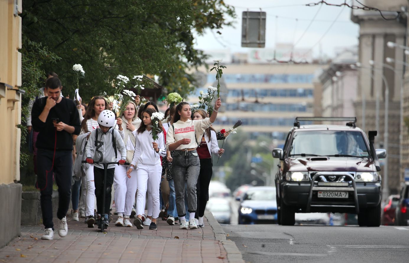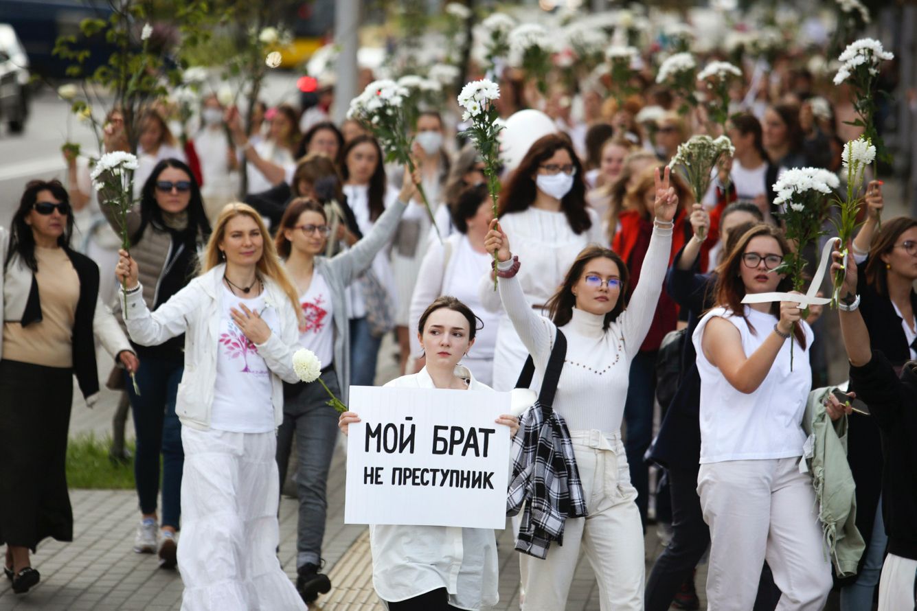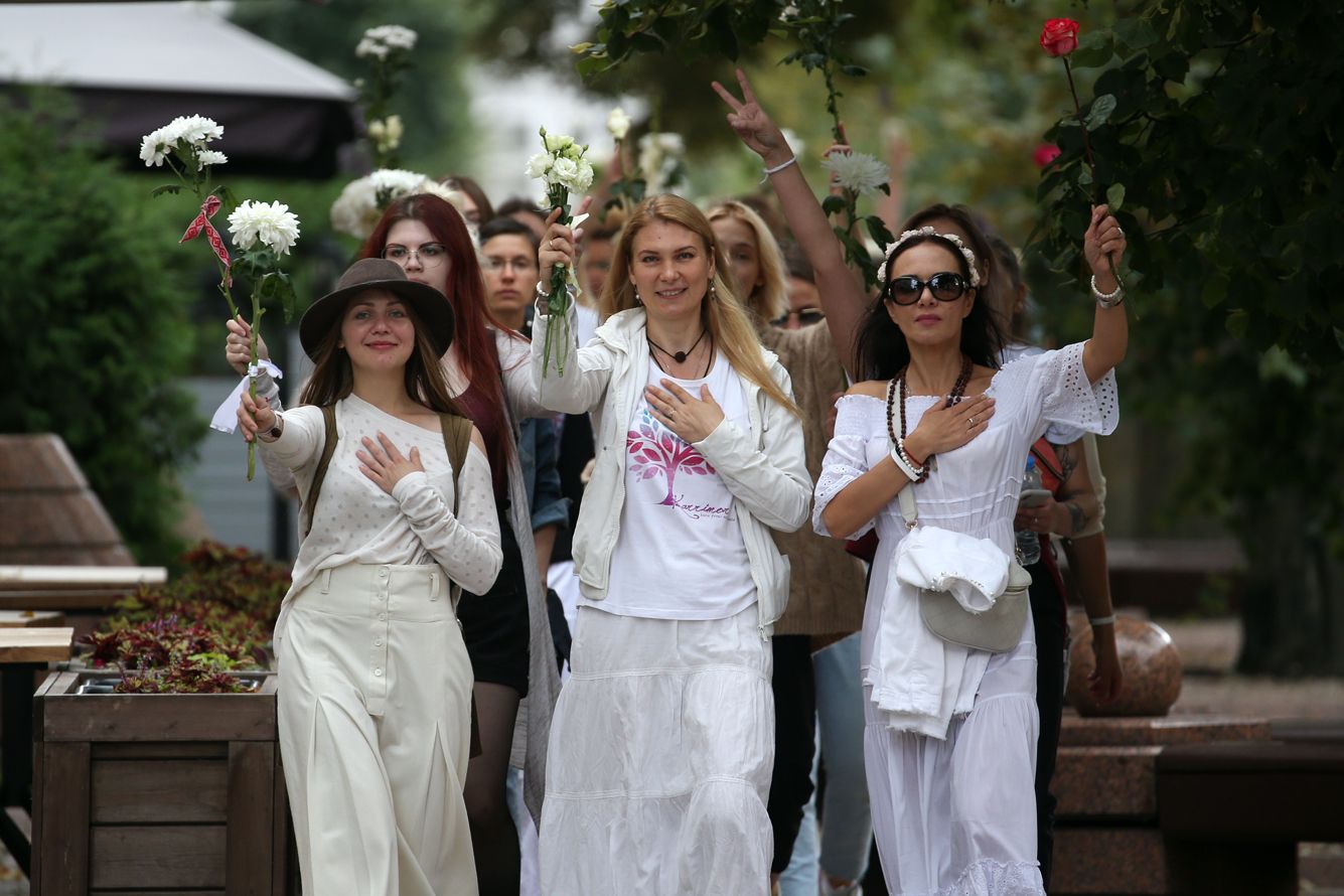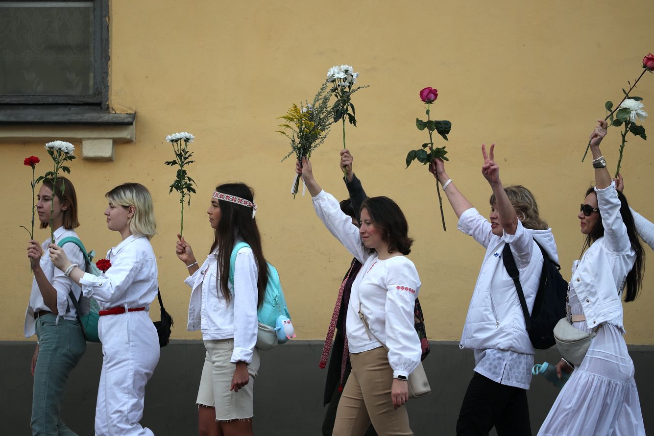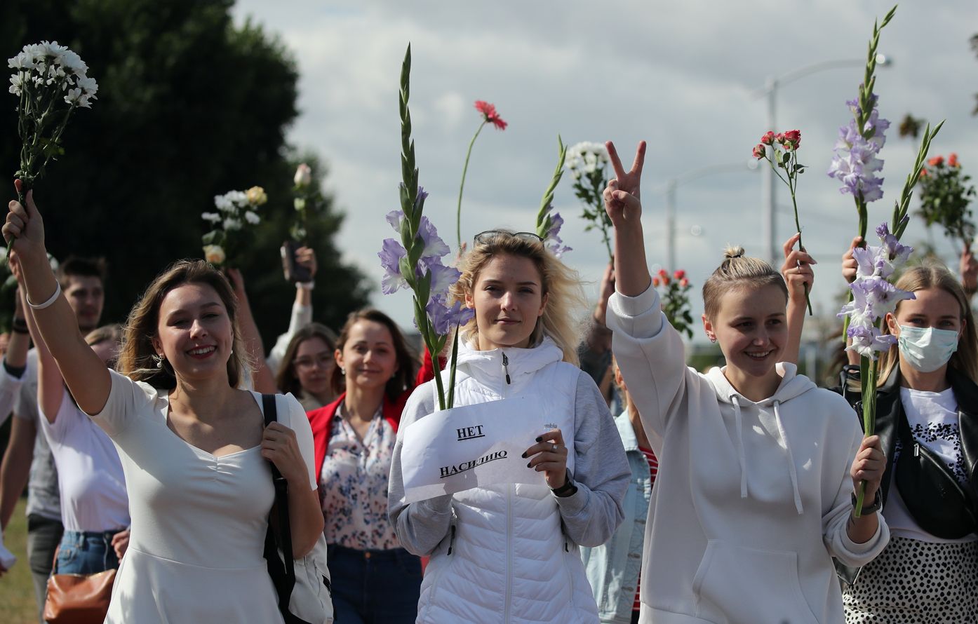 Belarus witnessed its fifth day of mass protests on Thursday, August 13, as people continued to demonstrate in opposition to the results of the presidential elections, which claim that incumbent President Alexander Lukashenko (Alyaksandr Lukashenka) won by a landslide 80 percent. During the day, people in cities throughout the country formed solidarity chains opposing the violence security forces used against protesters: these peaceful rallies were led by women who wore white and carried flowers. Large groups of doctors, transport workers, and factory workers joined the solidarity chains, as well. The Belarusian State Philharmonic’s choir also held its own action, performing the unofficial anthem of the Belarusian emigration “Magutny Bozha” (O God Almighty).