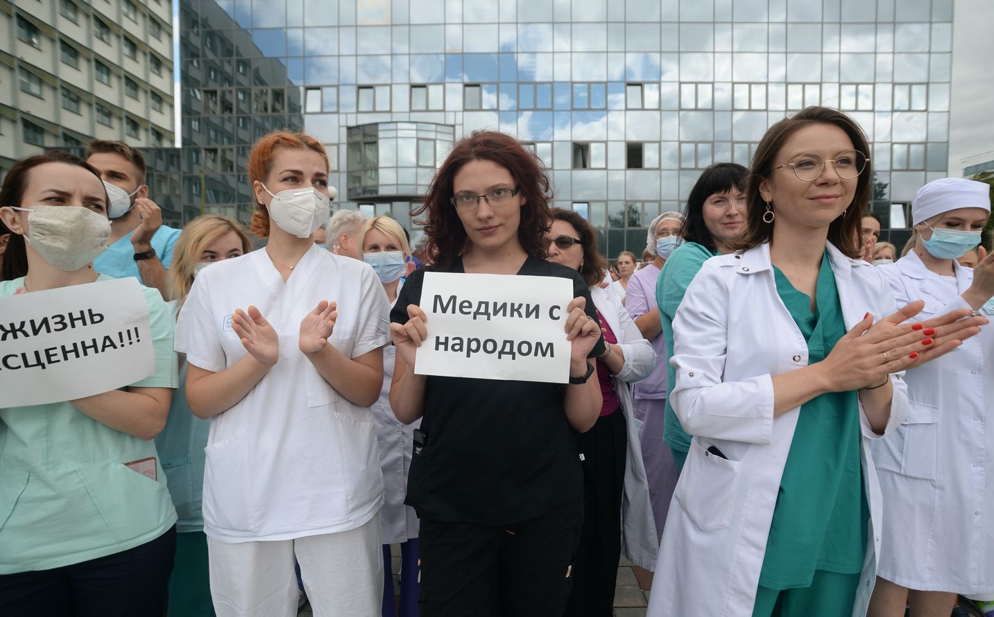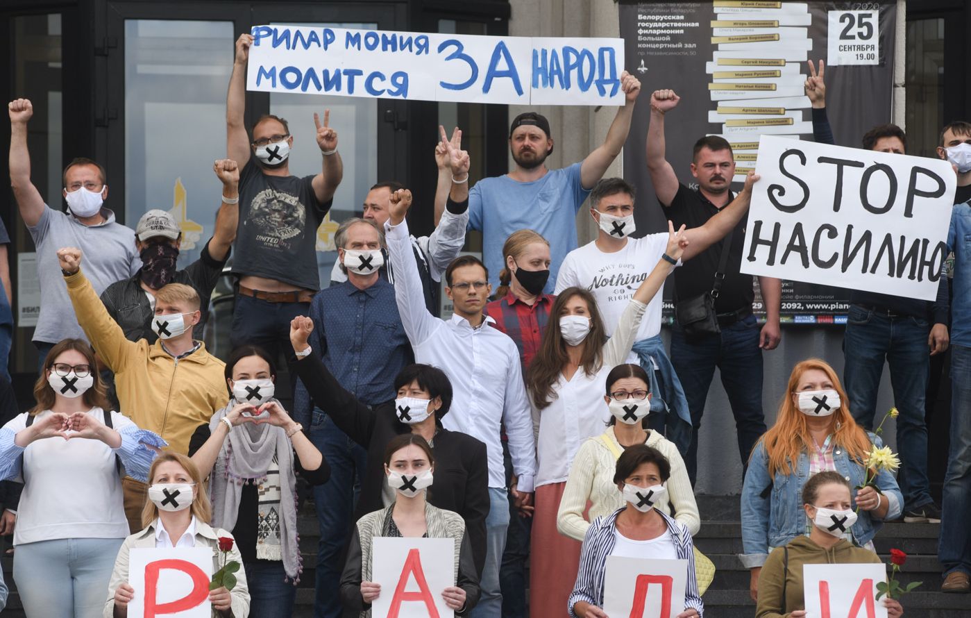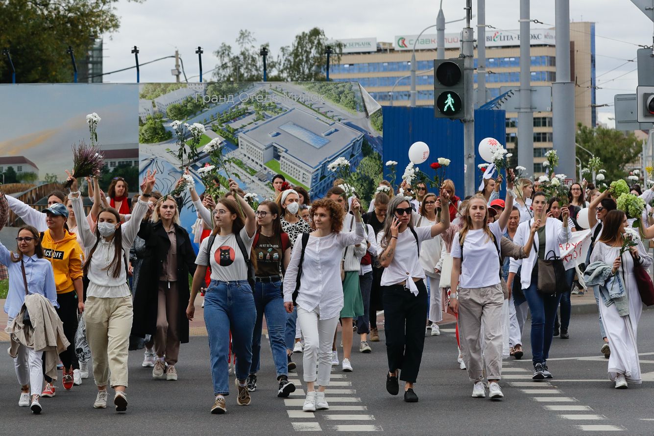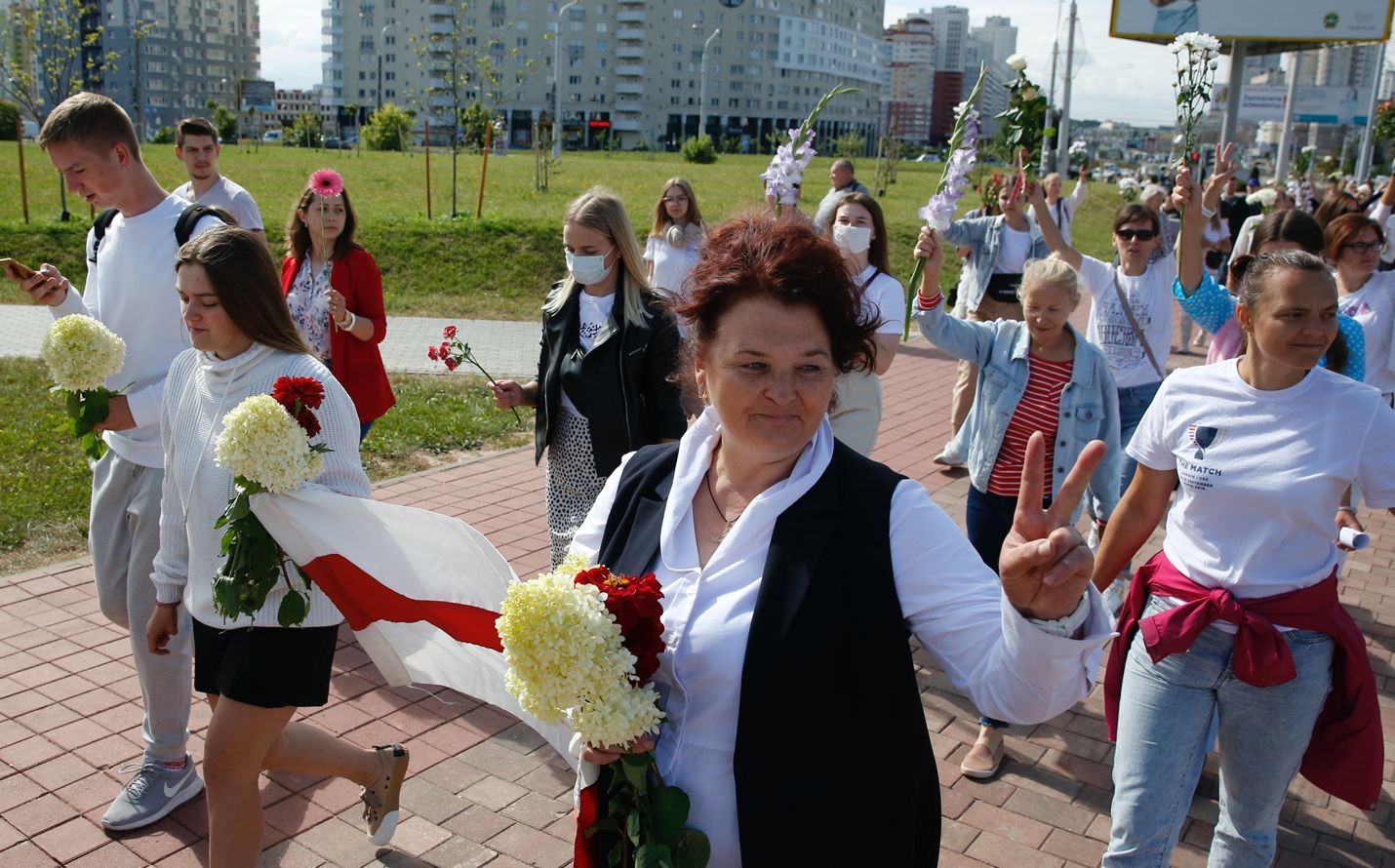 Belarus witnessed its fifth day of mass protests on Thursday, August 13, as people continued to demonstrate in opposition to the results of the presidential elections, which claim that incumbent President Alexander Lukashenko (Alyaksandr Lukashenka) won by a landslide 80 percent. During the day, people in cities throughout the country formed solidarity chains opposing the violence security forces used against protesters: these peaceful rallies were led by women who wore white and carried flowers. Large groups of doctors, transport workers, and factory workers joined the solidarity chains, as well. The Belarusian State Philharmonic’s choir also held its own action, performing the unofficial anthem of the Belarusian emigration “Magutny Bozha” (O God Almighty).