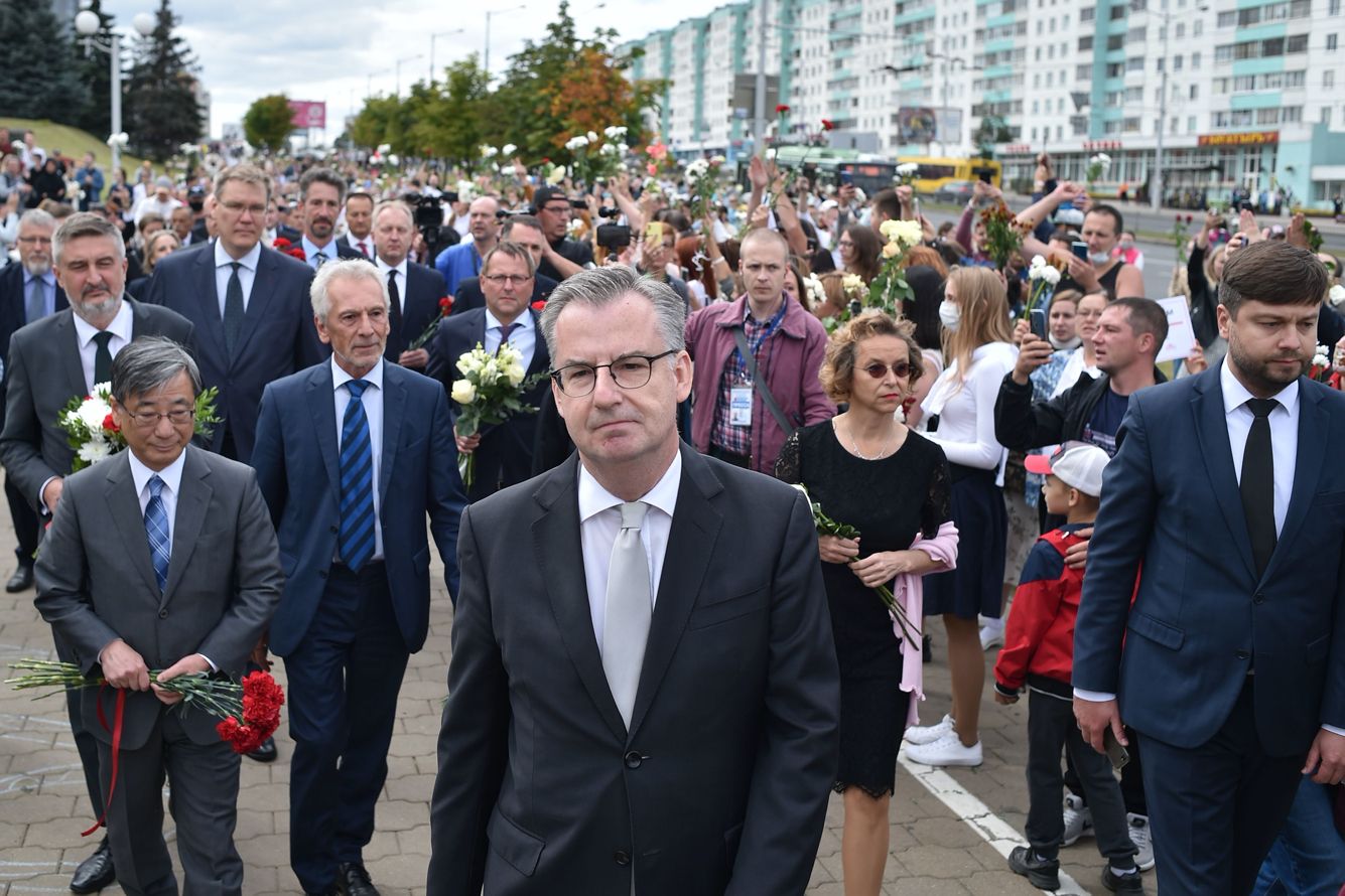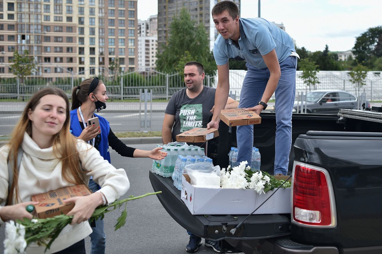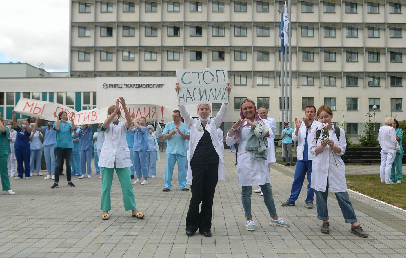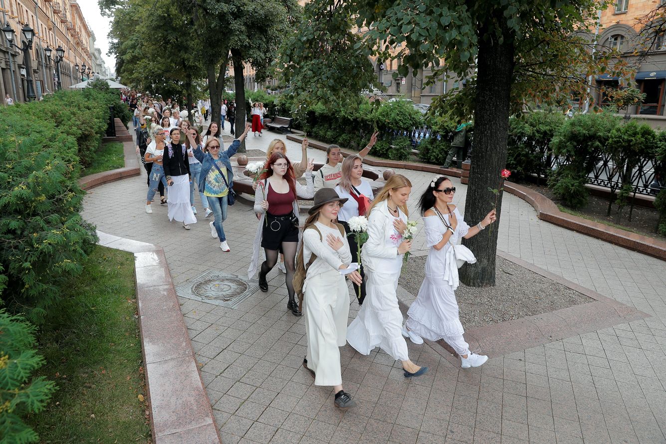 Belarus witnessed its fifth day of mass protests on Thursday, August 13, as people continued to demonstrate in opposition to the results of the presidential elections, which claim that incumbent President Alexander Lukashenko (Alyaksandr Lukashenka) won by a landslide 80 percent. During the day, people in cities throughout the country formed solidarity chains opposing the violence security forces used against protesters: these peaceful rallies were led by women who wore white and carried flowers. Large groups of doctors, transport workers, and factory workers joined the solidarity chains, as well. The Belarusian State Philharmonic’s choir also held its own action, performing the unofficial anthem of the Belarusian emigration “Magutny Bozha” (O God Almighty).