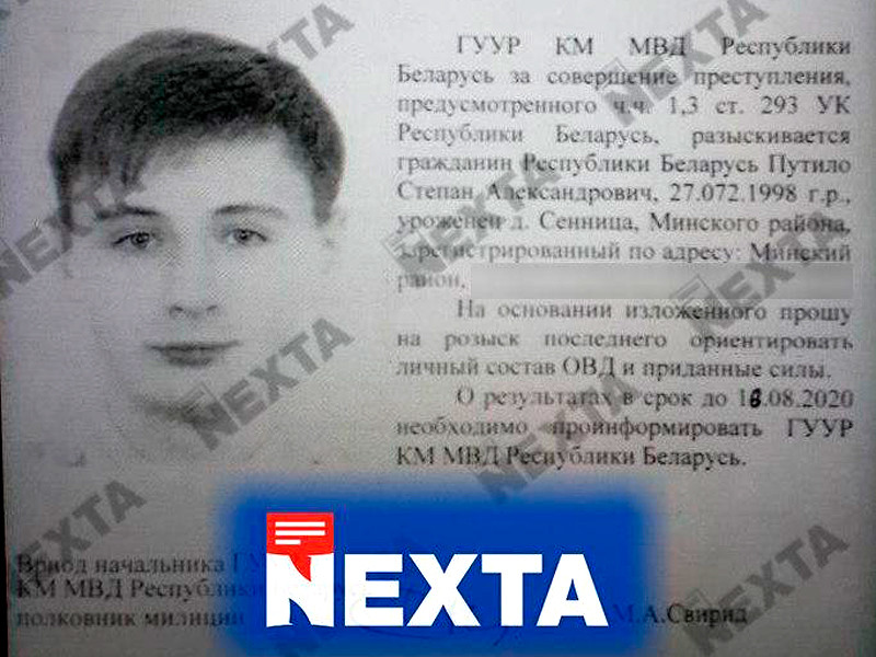В отношении основателя телеграм-каналов NEXTA Степана Путило МВД Белоруссии возбудило уголовное дело. Канал Nexta Live опубликовал (один из трех каналов NEXTA) фотокопию документа об объявлении в розыск Степана Путило 1998 года рождения.
