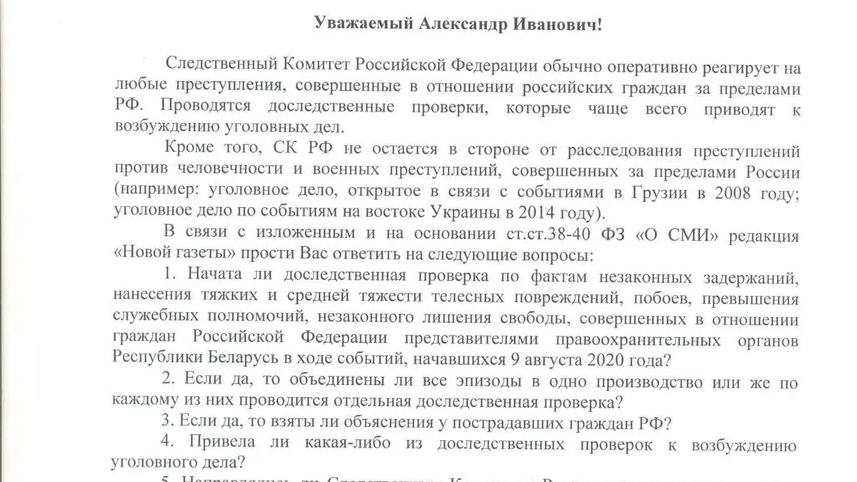 Редакция «Новой газеты» направила запрос на имя главы Следственного комитета России Александра Бастрыкина с просьбой объяснить, начал ли СК доследственную проверку по фактам незаконных задержаний и избиений россиян белорусскими силовиками на акциях протеста.