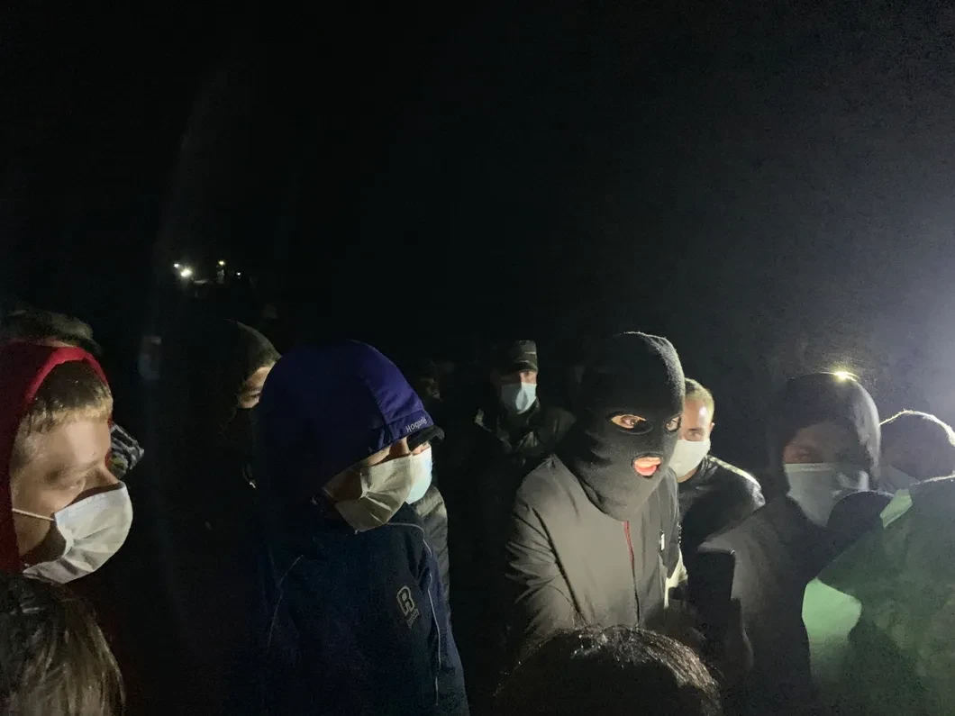 Первыми в свет прожекторов выходят мужчины в синем камуфляже. Человек 50. Их лица прячут капюшоны и маски. На рукавах — нашивки ЧОП «Вершина», охранной компании, нанятой «БСК». У каждого — по резиновой дубинке.