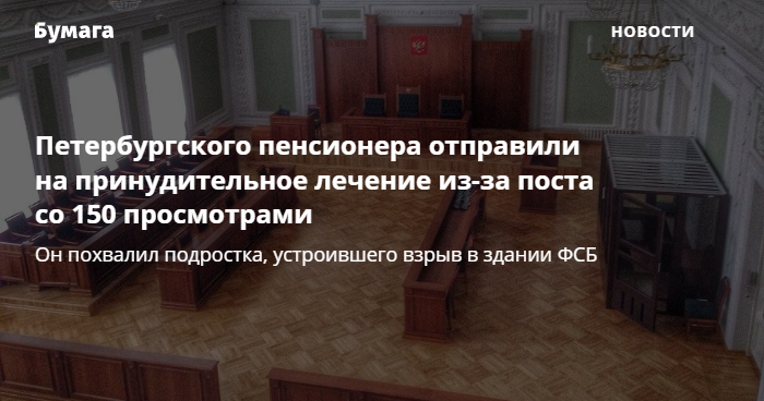 1-й Западный окружной военный суд направил на принудительное лечение 68-летнего пенсионера из Петербурга Александра Коваленко, которого обвиняли в оправдании терроризма. Об этом сообщает издание «Север.Реалии» со ссылкой на Коваленко и его жену.