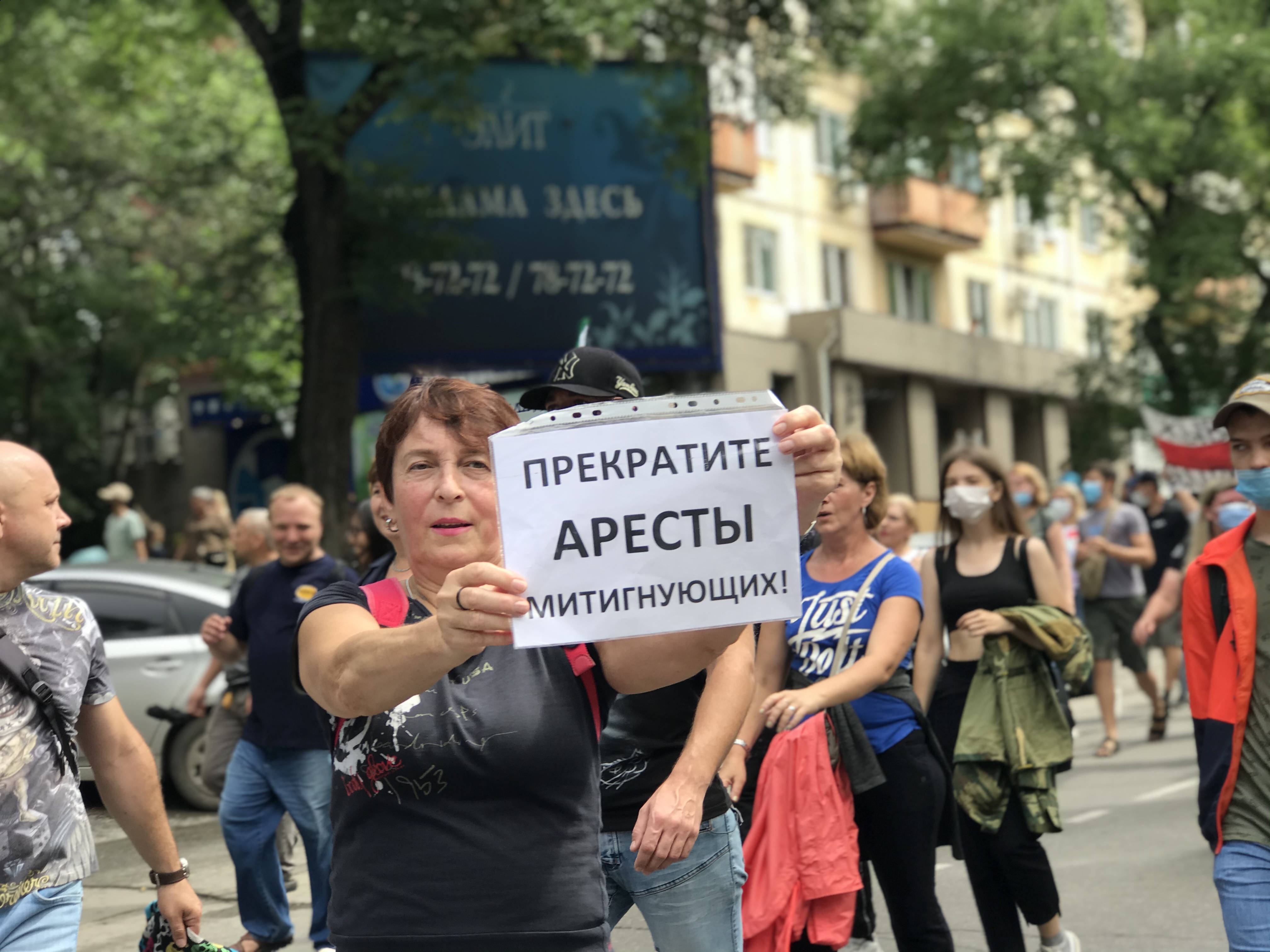 – Мы не боимся, что нас начнут разгонять. Мы не боимся уже ничего, – говорит Сергей Глазьев. – Нас довели уже до такой степени, что нам нечего бояться и терять. Если власть начнет проявлять агрессию, мы будем сопротивляться. Мы с женой приехали из Вяземского (город в Хабаровском крае. – Прим. С.Р.), и мы хотим сегодня поддержать не только хабаровчан, не только Сергея Ивановича, которого оболгали и незаконно усадили в тюрьму. Мы также хотим подержать белорусов, которые устали от Лукашенко. Они его не выбирали, а он все равно держится за власть и сейчас уничтожает свой народ. Там просто жесть. Но я рад, что белорусы отстаивают свой выбор.