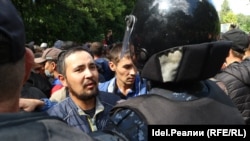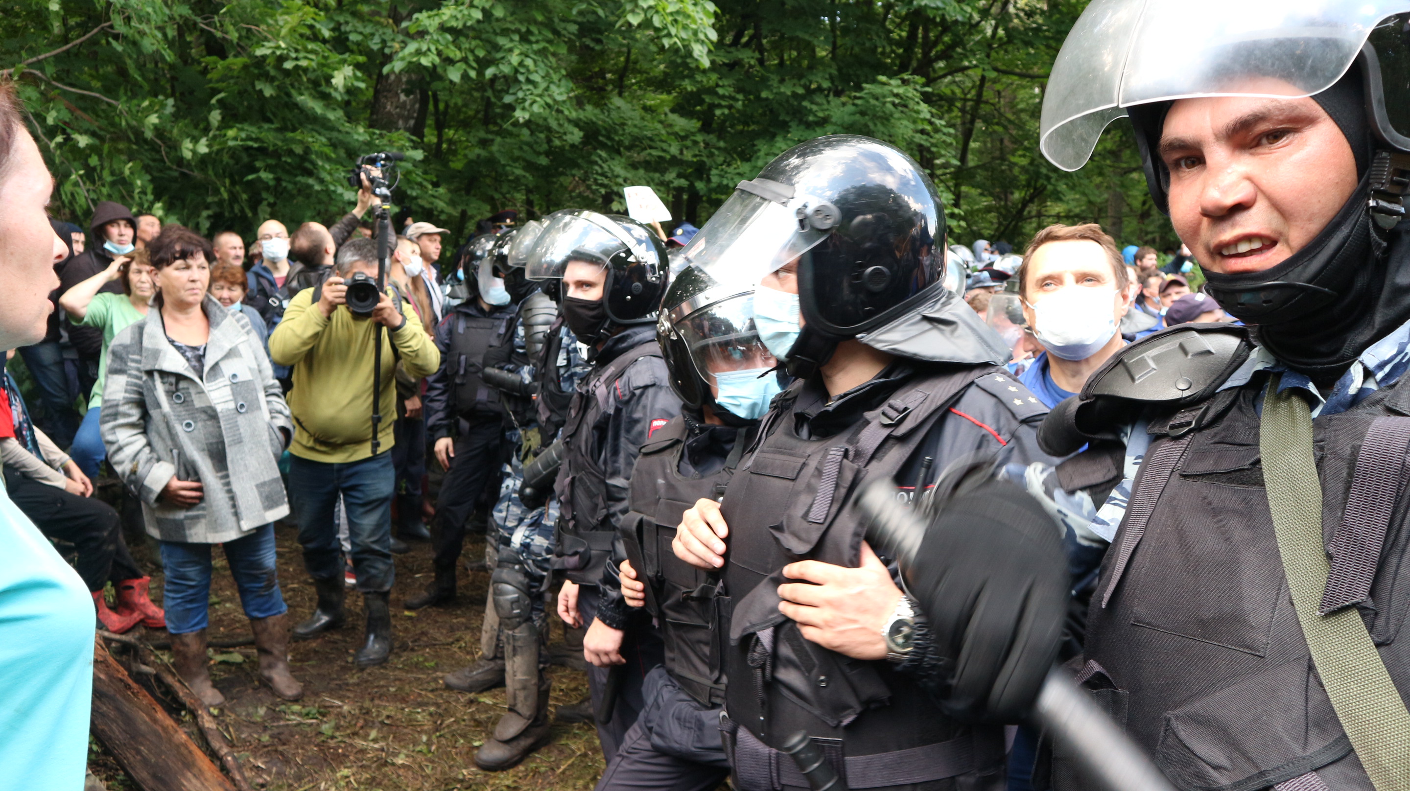 защитников шихана Куштау с сотрудниками частных охранных предприятий, присланных на "флешмоб", организованный в защиту разработки горы для "Башкирской содовой компании".