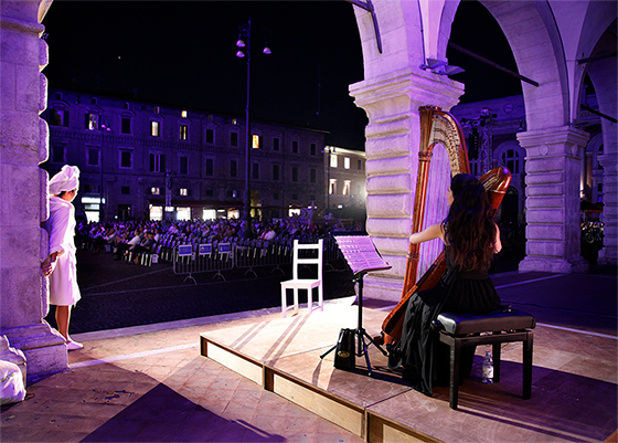 В ритуал входят и обязательные несколько представлений «Путешествия в Реймс» в давней постановке Эмилио Саджи, которые ежегодно знакомят публику и профессионалов (а директора театров и руководители фестивалей обязательно среди них) с молодыми артистами, участниками Молодежной программы. Они овладевают премудростями россиниевского стиля в ходе массированного обучения прямо здесь, на фестивале. Интригующий показ результатов проходил всегда на маленькой сцене Teatro Rossini, а теперь — на площади, в труднейших условиях открытого пространства, микрофонной подзвучки и отсутствия обратной связи от теряющейся в темноте аудитории. Состав, один из самых сильных как минимум за последний десяток лет, был «обстрелян» в предыдущем сезоне, предъявив под руководством дирижера Джанкарло Рицци уверенный вокальный и сценический профессионализм, достойный любой большой сцены. Запомним имя исполнительницы партии Коринны — итальянки Марии Лауры Джакобеллис.