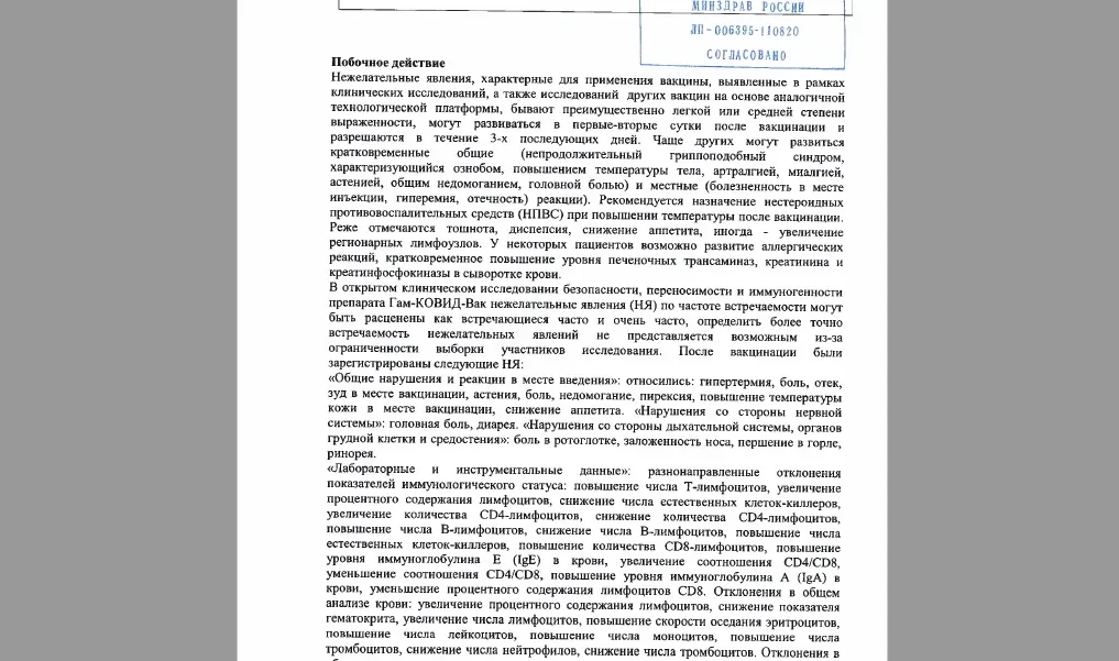Я скачал из интернета и прочитал инструкцию по медицинскому применению препарата Гам-Ковид-Вак. На четвертой странице там приведен перечень побочных действий, они занимают всю эту страницу.