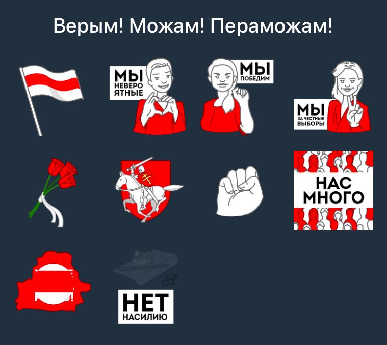 15 августа Telegram запустил официальный канал Беларуси в телеграме — и даже нарисовал специальные стикеры с медведем, рыбкой, Светланой Тихановской и лозунгом «Жыве Беларусь».