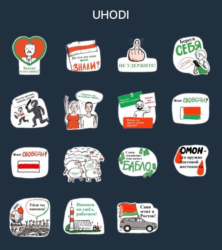 Участники протеста ответили набором стикеров «Уходи». Там все те же самые рисунки, что и в «За Беларусь», вот только смысл совсем другой.