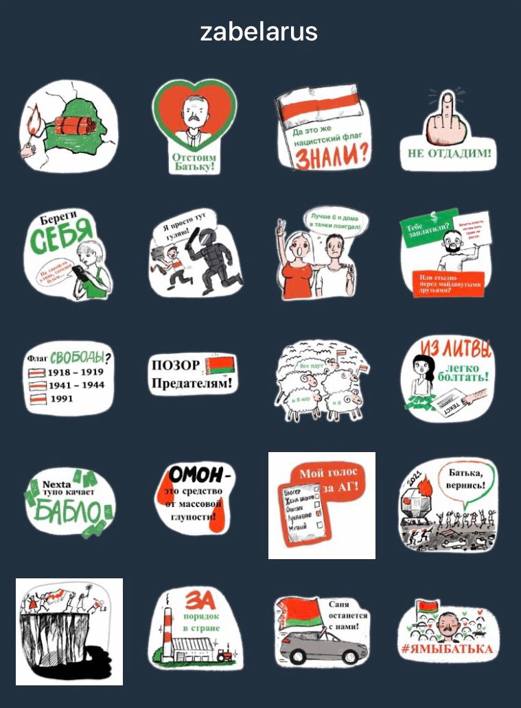 На другом стикере «За Беларусь» участников протестов изобразили овцами — именно так митингующих охарактеризовал Лукашенко. Есть здесь и стикер с омоновцем, который гонится за протестующим — у того в руках подожженый коктейль Молотова. Тут же можно увидеть стикер с надписью «ОМОН — это средство от массовой глупости». Есть стикер со Светланой Тихановской и подписью «Из Литвы легко болтать» (Тихановская — главная соперница Лукашенко на выборах — сейчас находится в Литве). Оппозиционному телеграм-каналу Nexta тоже досталось — им посвящен стикер «Nexta тупо качает бабло».