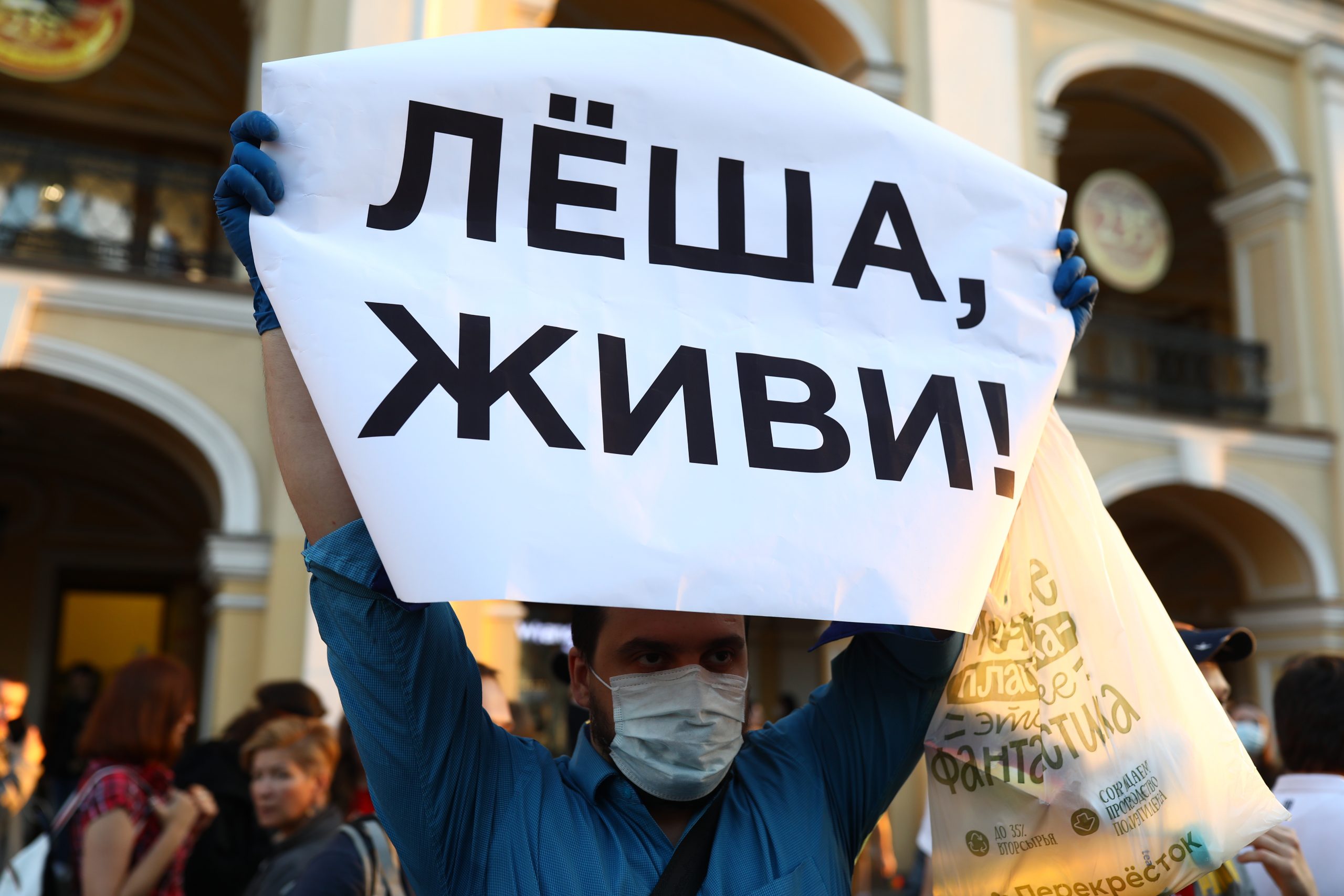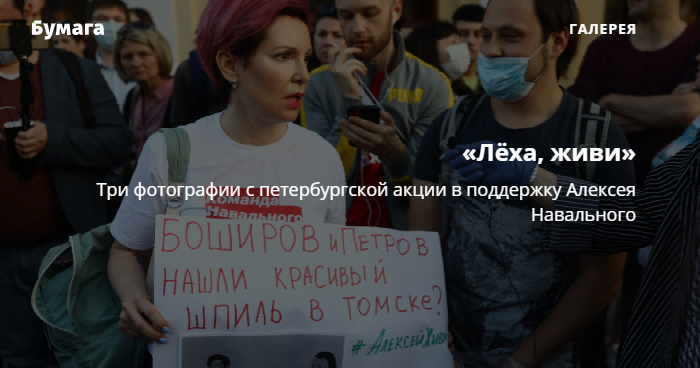 Вечером 20 августа у Гостиного двора петербуржцы встали в пикеты в поддержку Алексея Навального, госпитализированного в Омске с признаками отравления. Большинство активистов пришли с логотипами президентской кампании Навального и плакатами со словами «Лёша, живи». Очевидцы сообщают, что в центре города собралось более 100 человек. «Бумага» публикует три фотографии с акции.