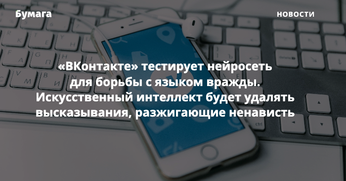 Социальная сеть «ВКонтакте» тестирует нейросеть для борьбы с языком вражды. Искусственный интеллект будет автоматически распознавать враждебные высказывания и удалять их, сообщили «Бумаге» в пресс-службе соцсети.