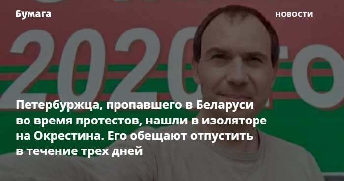 Петербуржца Михаила Дорожкина, задержанного в Минске 9 августа, нашли в изоляторе на улице Окрестина. Его должны отпустить в течение трех дней, сообщает «МБХ медиа» со ссылкой на друга Дорожкина Николая Лялина.