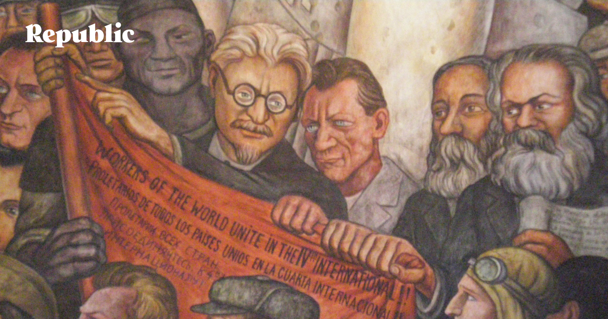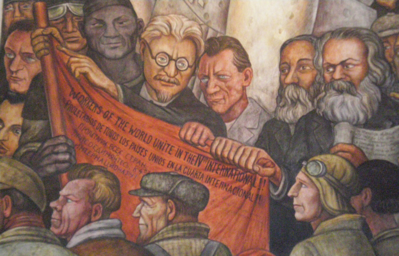 Лев Троцкий (в круглых очках) держит знамя Четвертого интернационала. Ему помогают Энгельс и Маркс (две бороды справа). Деталь фрески Диего Риверы "Человек, управляющий Вселенной". Мехико, Дворец изящных искусств, 1933