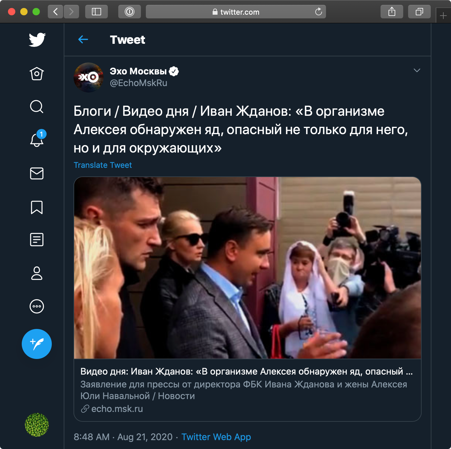 Главный редактор «Эха Москвы» Алексей Венедиктов, написавший о встрече российских и немецких врачей, в свою очередь заявил, что ФБК дезинформирует о яде, обнаруженном у Навального.