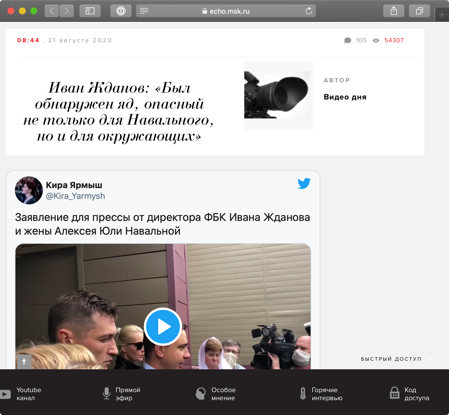 Пресс-секретарь Навального Кира Ярмыш попросила журналистов о том, чтобы на брифинге с Дмитрием Песковым они потребовали разъяснить, будет ли Кремль выполнять свое обещание помочь эвакуировать политика из больницы в Омске.