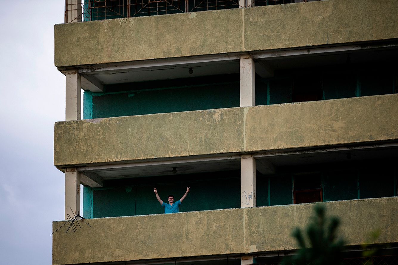 Один из сотрудников больницы в Омске показывает знак V — «Победа»