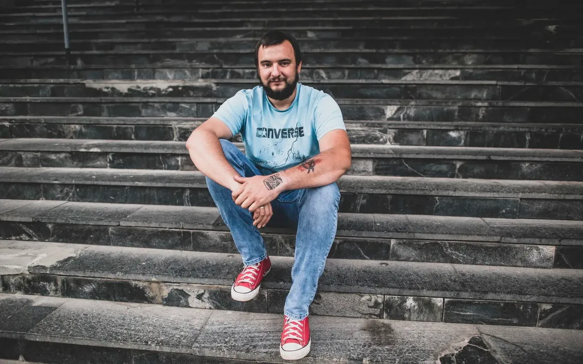 Дылевский одет в джинсы, футболку и кеды Converse, он бородат, с животиком, руки у него в татуировках — в общем, больше всего он напоминает повзрослевшего хипстера.