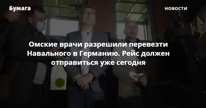 По словам Калиниченко, бригада немецких врачей, прибывшая в Омск для эвакуации Навального, посчитала, что пациент транспортабелен, и дала гарантии, что до Берлина его довезут живым. Перевозка должна начаться уже сегодня. Калиниченко добавил, что немецкие врачи удовлетворены ходом лечения в омской больнице и согласились с диагнозом местных специалистов.