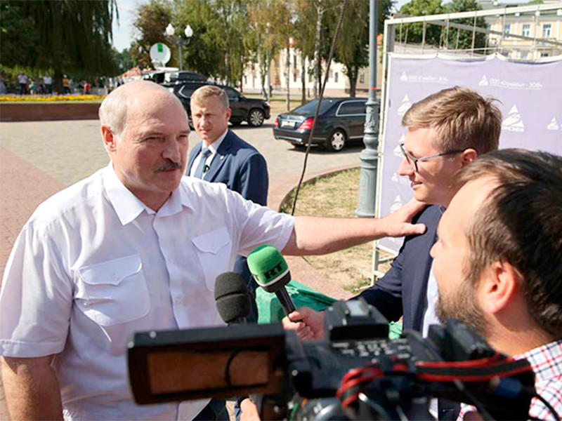 На вопрос телеканала RT, как сейчас проходит общение с Россией, Лукашенко ответил: "Хорошо проходит". Однако в подробности вдаваться не стал.