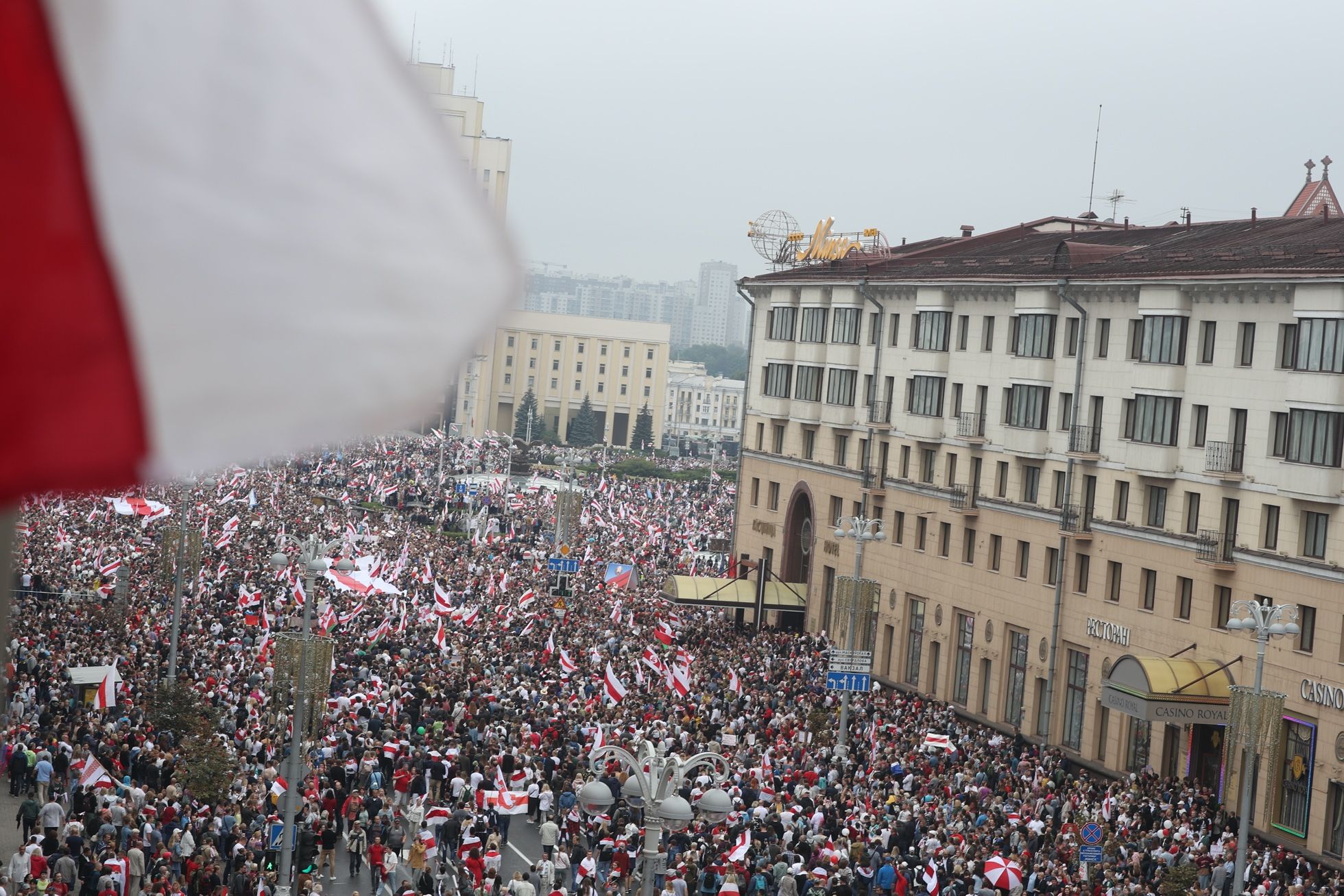 Евгений Фельдман для «Медузы» В центре Минска проходит массовая протестная акция, на которую, по оценкам Euroradio, Tut.by и телеграм-канала Nexta, собрались 100 тысяч человек. «Наша нива» сообщает, что людей даже больше, чем было на акции в прошлое воскресенье — тогда в центре Минска собрались 200 тысяч протестующих, это была самая массовая акция в истории Беларуси. «Белсат» тоже отмечает, что людей на митинге 23 августа может быть около 200 тысяч.